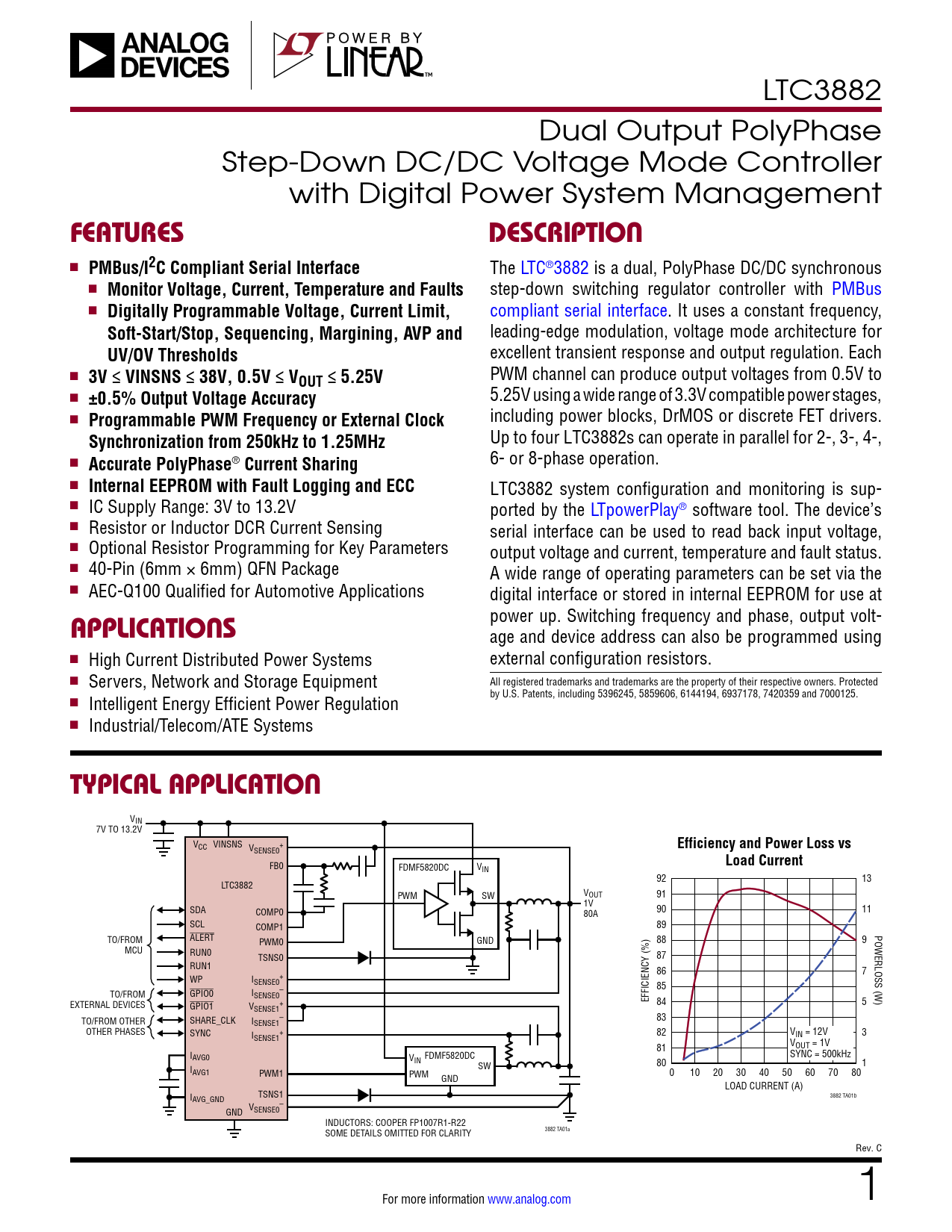 LTC3882 Dual Output PolyPhase Step-Down DC/DC Voltage Mode Controller with Digital Power System Management FEATURESDESCRIPTION n PMBus/I2C Compliant Serial Interface The LTC®3882 is a dual, PolyPhase DC/DC synchronous n Monitor Voltage, Current, Temperature and Faults step-down switching regulator controller with PMBus n Digitally Programmable Voltage, Current Limit, compliant serial interface. It uses a constant frequency, Soft-Start/Stop, Sequencing, Margining, AVP and leading-edge modulation, voltage mode architecture for UV/OV Thresholds excellent transient response and output regulation. Each n 3V ≤ VINSNS ≤ 38V, 0.5V ≤ V PWM channel can produce output voltages from 0.5V to OUT ≤ 5.25V n ±0.5% Output Voltage Accuracy 5.25V using a wide range of 3.3V compatible power stages, n Programmable PWM Frequency or External Clock including power blocks, DrMOS or discrete FET drivers. Up to four LTC3882s can operate in parallel for 2-, 3-, 4-, Synchronization from 250kHz to 1.25MHz n 6- or 8-phase operation. Accurate PolyPhase ® Current Sharing n Internal EEPROM with Fault Logging and ECC LTC3882 system configuration and monitoring is sup- n IC Supply Range: 3V to 13.2V ported by the LTpowerPlay® software tool. The device’s n Resistor or Inductor DCR Current Sensing serial interface can be used to read back input voltage, n Optional Resistor Programming for Key Parameters output voltage and current, temperature and fault status. n 40-Pin (6mm × 6mm) QFN Package A wide range of operating parameters can be set via the n AEC-Q100 Qualified for Automotive Applications digital interface or stored in internal EEPROM for use at power up. Switching frequency and phase, output volt- APPLICATIONS age and device address can also be programmed using n High Current Distributed Power Systems external configuration resistors. n All registered trademarks and trademarks are the property of their respective owners. Protected Servers, Network and Storage Equipment by U.S. Patents, including 5396245, 5859606, 6144194, 6937178, 7420359 and 7000125. n Intelligent Energy Efficient Power Regulation n Industrial/Telecom/ATE Systems TYPICAL APPLICATION VIN 7V TO 13.2V VCC VINSNS V + Efficiency and Power Loss vs SENSE0 Load Current FB0 FDMF5820DC VIN 92 13 LTC3882 PWM V SW OUT 91 1V SDA COMP0 80A 90 11 SCL COMP1 89 POWERLOSS (W) TO/FROM ALERT PWM0 GND 88 9 MCU RUN0 TSNS0 87 RUN1 86 7 WP I + SENSE0 85 TO/FROM GPIO0 I – SENSE0 EFFICIENCY (%) EXTERNAL DEVICES GPIO1 V + 84 5 SENSE1 TO/FROM OTHER SHARE_CLK I – 83 SENSE1 OTHER PHASES SYNC I + 82 VIN = 12V 3 SENSE1 81 VOUT = 1V IAVG0 V FDMF5820DC SYNC = 500kHz IN SW 80 1 IAVG1 PWM1 PWM 0 10 20 30 40 50 60 70 80 GND LOAD CURRENT (A) TSNS1 IAVG_GND 3882 TA01b V – SENSE0 GND INDUCTORS: COOPER FP1007R1-R22 3882 TA01a SOME DETAILS OMITTED FOR CLARITY Rev. C For more information www.analog.com 1 Document Outline Features Applications Typical Application Description Absolute Maximum Ratings Order Information Pin Configuration Electrical Characteristics Block Diagram Test Circuit Timing Diagram Operation Overview Main Control Loop Power-Up and Initialization Soft-Start Time-Based Output Sequencing Output Ramping Control Voltage-Based Output Sequencing Output Disable Minimum Output Disable Times Output Short Cycle Light Load Current Operation Switching Frequency and Phase PolyPhase Load Sharing Active Voltage Positioning Input Supply Monitoring Output Voltage Sensing and Monitoring Output Current Sensing and Monitoring External and Internal Temperature Sense Resistor Configuration Pins Internal EEPROM with ECC and CRC Fault Detection Input Supply Faults Hardwired PWM Response to VOUT Faults Power Good Indication Hardwired PWM Response to IOUT Faults Hardwired PWM Response to Temperature Faults Hardwired PWM Response to Timing Faults External Faults Fault Handling Status Registers and ALERT Masking Mapping Faults to GPIO Pins Other GPIO Uses Fault Logging Factory Default Operation Serial Interface Serial Bus Addressing Serial Bus Timeout Serial Communication Errors PMBus Command Summary PMBus Commands Data Formats Applications Information Efficiency Considerations PWM Frequency and Inductor Selection Power MOSFET Selection MOSFET Driver Selection Using PWM Protocols CIN Selection COUT Selection Feedback Loop Compensation PCB Layout Considerations Output Current Sensing Output Voltage Sensing Soft-Start and Stop Time-Based Output Sequencing and Ramping Voltage-Based Output Sequencing Using Output Voltage Servo Using AVP PWM Frequency Synchronization PolyPhase Operation and Load Sharing External Temperature Sense Resistor Configuration Pins Internal Regulator Outputs IC Junction Temperature Derating EEPROM Retention at Temperature Configuring Open-Drain Pins PMBus Communication and Command Processing Status and Fault Log Management LTpowerPlay – An Interactive Digital Power GUI Interfacing to the DC1613 Design Example PMBus COMMAND DETAILS Addressing and Write Protect PAGE PAGE_PLUS_WRITE PAGE_PLUS_READ WRITE_PROTECT MFR_ADDRESS MFR_RAIL_ADDRESS General Device Configuration PMBUS_REVISION CAPABILITY On, Off and Margin Control ON_OFF_CONFIG MFR_CONFIG_ALL_LTC3882 OPERATION MFR_RESET PWM Configuration FREQUENCY_SWITCH MFR_PWM_CONFIG_LTC3882 MFR_CHAN_CONFIG_LTC3882 MFR_PWM_MODE_LTC3882 Input Voltage and Limits VIN_ON VIN_OFF VIN_OV_FAULT_LIMIT VIN_UV_WARN_LIMIT Output Voltage and Limits VOUT_MODE VOUT_COMMAND MFR_VOUT_MAX VOUT_MAX MFR_VOUT_AVP VOUT_MARGIN_HIGH VOUT_MARGIN_LOW VOUT_OV_FAULT_LIMIT VOUT_OV_WARN_LIMIT VOUT_UV_WARN_LIMIT VOUT_UV_FAULT_LIMIT Output Current and Limits IOUT_CAL_GAIN MFR_IOUT_CAL_GAIN_TC IOUT_OC_FAULT_LIMIT IOUT_OC_WARN_LIMIT Output Timing, Delays, and Ramping MFR_RESTART_DELAY TON_DELAY TON_RISE TON_MAX_FAULT_LIMIT VOUT_TRANSITION_RATE TOFF_DELAY TOFF_FALL TOFF_MAX_WARN_LIMIT External Temperature and Limits MFR_TEMP_1_GAIN MFR_TEMP_1_OFFSET OT_FAULT_LIMIT OT_WARN_LIMIT Status Reporting STATUS_BYTE UT_FAULT_LIMIT STATUS_WORD STATUS_VOUT STATUS_