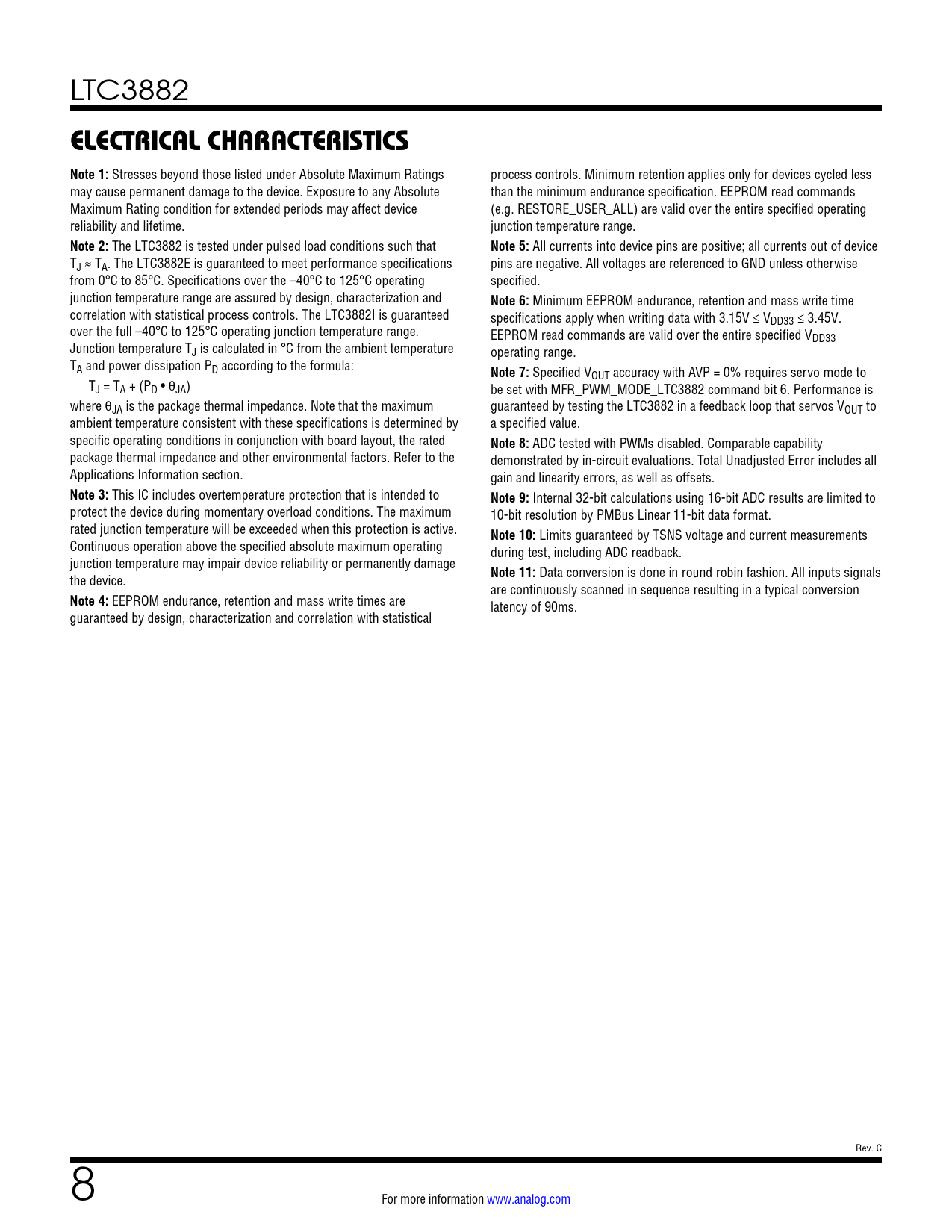 Minimum EEPROM endurance, retention and mass write time correlation with statistical process controls. The LTC3882I is guaranteed specifications apply when writing data with 3.15V ≤ VDD33 ≤ 3.45V. over the full –40°C to 125°C operating junction temperature range. EEPROM read commands are valid over the entire specified VDD33 Junction temperature TJ is calculated in °C from the ambient temperature operating range. TA and power dissipation PD according to the formula:
