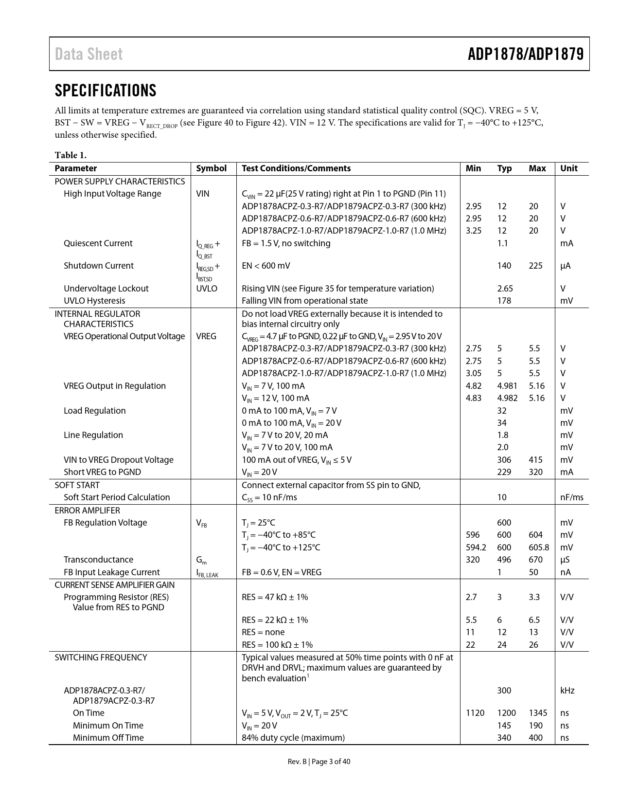 Data Sheet. ADP1878/ADP1879. SPECIFICATIONS. Table 1. Parameter. Symbol. Test Conditions/Comments. Min. Typ. Max. Unit