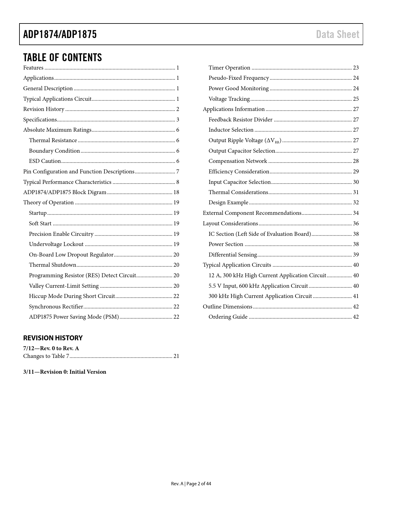 link to page 1 link to page 1 link to page 1 link to page 1 link to page 2 link to page 3 link to page 6 link to page 6 link to page 6 link to page 6 link to page 7 link to page 8 link to page 18 link to page 19 link to page 19 link to page 19 link to page 19 link to page 19 link to page 20 link to page 20 link to page 20 link to page 20 link to page 22 link to page 22 link to page 22 link to page 23 link to page 24 link to page 24 link to page 25 link to page 27 link to page 27 link to page 27 link to page 27 link to page 27 link to page 28 link to page 29 link to page 30 link to page 31 link to page 32 link to page 34 link to page 36 link to page 38 link to page 38 link to page 39 link to page 40 link to page 40 link to page 40 link to page 41 link to page 42 link to page 42 ADP1874/ADP1875Data SheetTABLE OF CONTENTS Features .. 1 Timer Operation .. 23 Applications ... 1 Pseudo-Fixed Frequency ... 24 General Description ... 1 Power Good Monitoring ... 24 Typical Applications Circuit .. 1 Voltage Tracking ... 25 Revision History ... 2 Applications Information .. 27 Specifications ... 3 Feedback Resistor Divider .. 27 Absolute Maximum Ratings .. 6 Inductor Selection .. 27 Thermal Resistance .. 6 Output Ripple Voltage (ΔVRR) .. 27 Boundary Condition .. 6 Output Capacitor Selection... 27 ESD Caution .. 6 Compensation Network .. 28 Pin Configuration and Function Descriptions ... 7 Efficiency Consideration ... 29 Typical Performance Characteristics ... 8 Input Capacitor Selection .. 30 ADP1874/ADP1875 Block Digram ... 18 Thermal Considerations .. 31 Theory of Operation .. 19 Design Example .. 32 Startup .. 19 External Component Recommendations .. 34 Soft Start .. 19 Layout Considerations ... 36 Precision Enable Circuitry .. 19 IC Section (Left Side of Evaluation Board) ... 38 Undervoltage Lockout ... 19 Power Section ... 38 On-Board Low Dropout Regulator .. 20 Differential Sensing .. 39 Thermal Shutdown ... 20 Typical Application Circuits ... 40 Programming Resistor (RES) Detect Circuit .. 20 12 A, 300 kHz High Current Application Circuit .. 40 Valley Current-Limit Setting .. 20 5.5 V Input, 600 kHz Application Circuit ... 40 Hiccup Mode During Short Circuit ... 22 300 kHz High Current Application Circuit .. 41 Synchronous Rectifier .. 22 Outline Dimensions ... 42 ADP1875 Power Saving Mode (PSM) .. 22 Ordering Guide .. 42 REVISION HISTORY 7/12—Rev. 0 to Rev. A Changes to Table 7 .. 21 3/11—Revision 0: Initial Version Rev. A | Page 2 of 44 Document Outline Features Applications General Description Typical Applications Circuit Table of Contents Revision History Specifications Absolute Maximum Ratings Thermal Resistance Boundary Condition ESD Caution Pin Configuration and Function Descriptions Typical Performance Characteristics ADP1874/ADP1875 Block Digram Theory of Operation Startup Soft Start Precision Enable Circuitry Undervoltage Lockout On-Board Low Dropout Regulator Thermal Shutdown Programming Resistor (RES) Detect Circuit Valley Current-Limit Setting Hiccup Mode During Short Circuit Synchronous Rectifier ADP1875 Power Saving Mode (PSM) Timer Operation Pseudo-Fixed Frequency Power Good Monitoring Voltage Tracking Applications Information Feedback Resistor Divider Inductor Selection Output Ripple Voltage (ΔVRR) Output Capacitor Selection Compensation Network Output Filter Impedance (ZFILT) Error Amplifier Output Impedance (ZCOMP) Error Amplifier Gain (Gm) Current-Sense Loop Gain (GCS) Crossover Frequency Efficiency Consideration Channel Conduction Loss MOSFET Driver Loss Switching Loss Diode Conduction Loss Inductor Loss Input Capacitor Selection Thermal Considerations Design Example Input Capacitor Inductor Current Limit Programming Output Capacitor Feedback Resistor Network Setup Compensation Network Loss Calculations External Component Recommendations Layout Considerations IC Section (Left Side of Evaluation Board) Power Section Differential Sensing Typical Application Circuits 12 A, 300 kHz High Current Application Circuit 5.5 V Input, 600 kHz Application Circuit 300 kHz High Current Application Circuit Outline Dimensions Ordering Guide