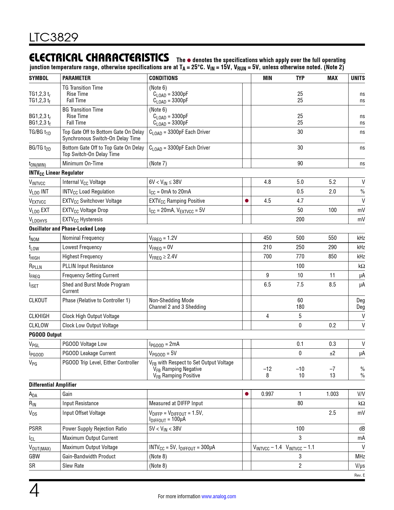 LTC3829 ELECTRICAL CHARACTERISTICSThe l denotes the specifications which apply over the full operatingjunction temperature range, otherwise specifications are at TA = 25°C. VIN = 15V, VRUN = 5V, unless otherwise noted. (Note 2)SYMBOLPARAMETERCONDITIONSMINTYPMAXUNITS TG Transition Time (Note 6) TG1,2,3 tr Rise Time CLOAD = 3300pF 25 ns TG1,2,3 tf Fall Time CLOAD = 3300pF 25 ns BG Transition Time (Note 6) BG1,2,3 tr Rise Time CLOAD = 3300pF 25 ns BG1,2,3 tf Fall Time CLOAD = 3300pF 25 ns TG/BG t1D Top Gate Off to Bottom Gate On Delay CLOAD = 3300pF Each Driver 30 ns Synchronous Switch-On Delay Time BG/TG t2D Bottom Gate Off to Top Gate On Delay CLOAD = 3300pF Each Driver 30 ns Top Switch-On Delay Time tON(MIN) Minimum On-Time (Note 7) 90 ns INTVCC Linear Regulator VINTVCC Internal VCC Voltage 6V < VIN ≤ 38V 4.8 5.0 5.2 V VLDO INT INTVCC Load Regulation ICC = 0mA to 20mA 0.5 2.0 % VEXTVCC EXTVCC Switchover Voltage EXTVCC Ramping Positive l 4.5 4.7 V VLDO EXT EXTVCC Voltage Drop ICC = 20mA, VEXTVCC = 5V 50 100 mV VLDOHYS EXTVCC Hysteresis 200 mV Oscillator and Phase-Locked Loop fNOM Nominal Frequency VFREQ = 1.2V 450 500 550 kHz fLOW Lowest Frequency VFREQ = 0V 210 250 290 kHz fHIGH Highest Frequency VFREQ ≥ 2.4V 700 770 850 kHz RPLLN PLLIN Input Resistance 100 kΩ IFREQ Frequency Setting Current 9 10 11 µA IISET Shed and Burst Mode Program 6.5 7.5 8.5 µA Current CLKOUT Phase (Relative to Controller 1) Non-Shedding Mode 60 Deg Channel 2 and 3 Shedding 180 Deg CLKHIGH Clock High Output Voltage 4 5 V CLKLOW Clock Low Output Voltage 0 0.2 V PGOOD Output VPGL PGOOD Voltage Low IPGOOD = 2mA 0.1 0.3 V IPGOOD PGOOD Leakage Current VPGOOD = 5V 0 ±2 µA VPG PGOOD Trip Level, Either Controller VFB with Respect to Set Output Voltage VFB Ramping Negative –12 –10 –7 % VFB Ramping Positive 8 10 13 % Differential Amplifier ADA Gain l 0.997 1 1.003 V/V RIN Input Resistance Measured at DIFFP Input 80 kΩ VOS Input Offset Voltage VDIFFP = VDIFFOUT = 1.5V, 2.5 mV IDIFFOUT = 100µA PSRR Power Supply Rejection Ratio 5V < VIN < 38V 100 dB ICL Maximum Output Current 3 mA VOUT(MAX) Maximum Output Voltage INTVCC = 5V, IDIFFOUT = 300µA VINTVCC – 1.4 VINTVCC – 1.1 V GBW Gain-Bandwidth Product (Note 8) 3 MHz SR Slew Rate (Note 8) 2 V/µs Rev. E 4 For more information www.analog.com Document Outline Features Applications Typical Application Description Absolute Maximum Ratings Pin Configuration Order Information Electrical Characteristics Typical Performance Characteristics Pin Functions Functional Diagram Operation Applications Information Typical Application Package Description Revision History Typical Application Related Parts