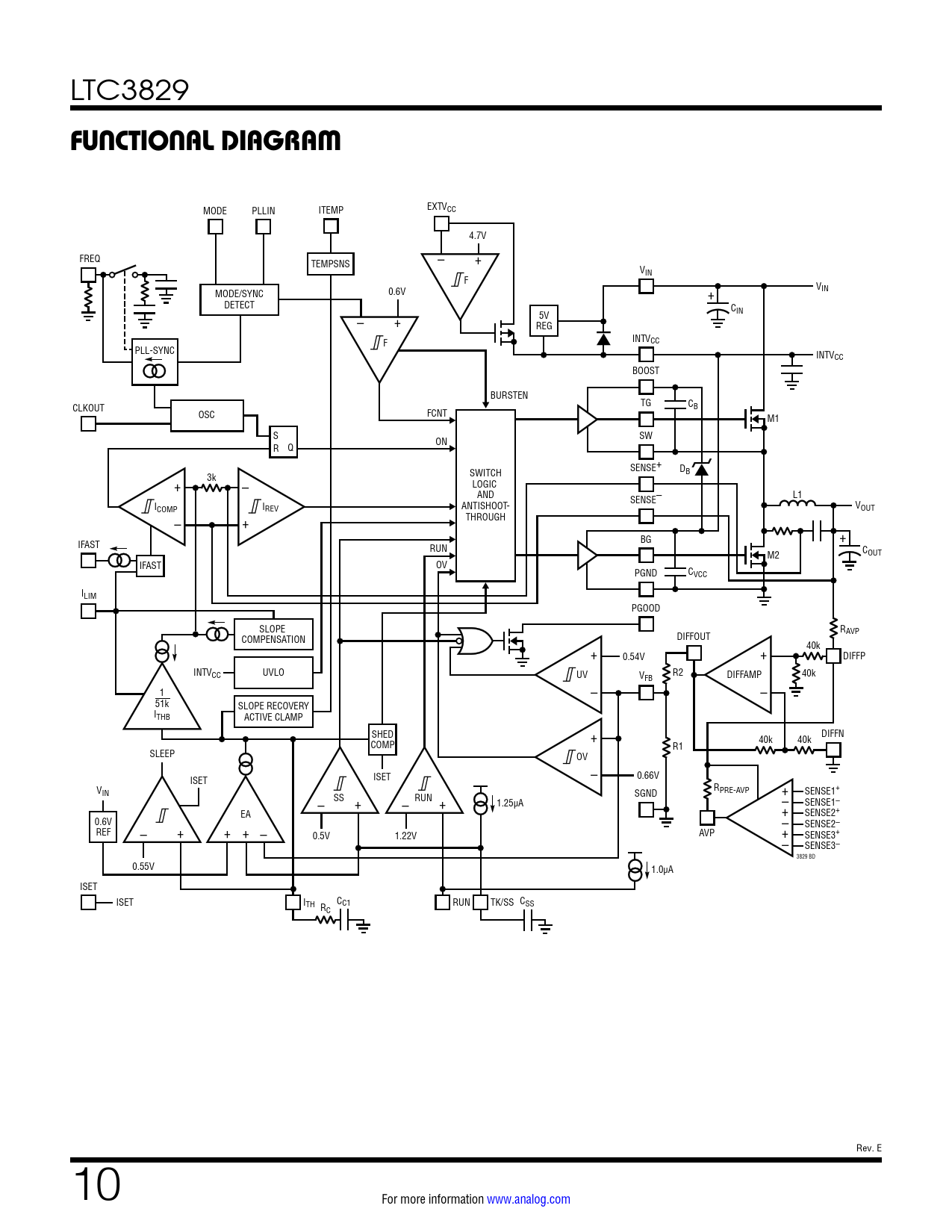 MODE PLLIN ITEMP EXTVCC 4.7V FREQ TEMPSNS – + VIN F V MODE/SYNC 0.6V IN + DETECT CIN – + 5V REG F INTVCC PLL-SYNC INTVCC BOOST BURSTEN CLKOUT TG CB OSC FCNT M1 S SW ON R Q SENSE+ DB 3k SWITCH + – LOGIC AND L1 SENSE– ICOMP IREV ANTISHOOT- VOUT – + THROUGH + IFAST BG RUN M2 COUT IFAST OV PGND CVCC ILIM PGOOD SLOPE RAVP COMPENSATION DIFFOUT 40k + 0.54V + DIFFP INTVCC UVLO UV V R2 DIFFAMP FB 40k 1 – – 51k SLOPE RECOVERY ITHB ACTIVE CLAMP SHED + DIFFN COMP 40k 40k R1 SLEEP OV – ISET ISET 0.66V V R IN – SGND PRE-AVP + SENSE1+ SS + – RUN + 1.25µA – SENSE1– EA + SENSE2+ 0.6V – + + + – – SENSE2– REF 0.5V 1.22V AVP + SENSE3+ – SENSE3– 3829 BD 0.55V 1.0µA ISET ISET ITH C R C1 RUN TK/SS CSS C Rev. E 10 For more information www.analog.com Document Outline Features Applications Typical Application Description Absolute Maximum Ratings Pin Configuration Order Information Electrical Characteristics Typical Performance Characteristics Pin Functions Functional Diagram Operation Applications Information Typical Application Package Description Revision History Typical Application Related Parts