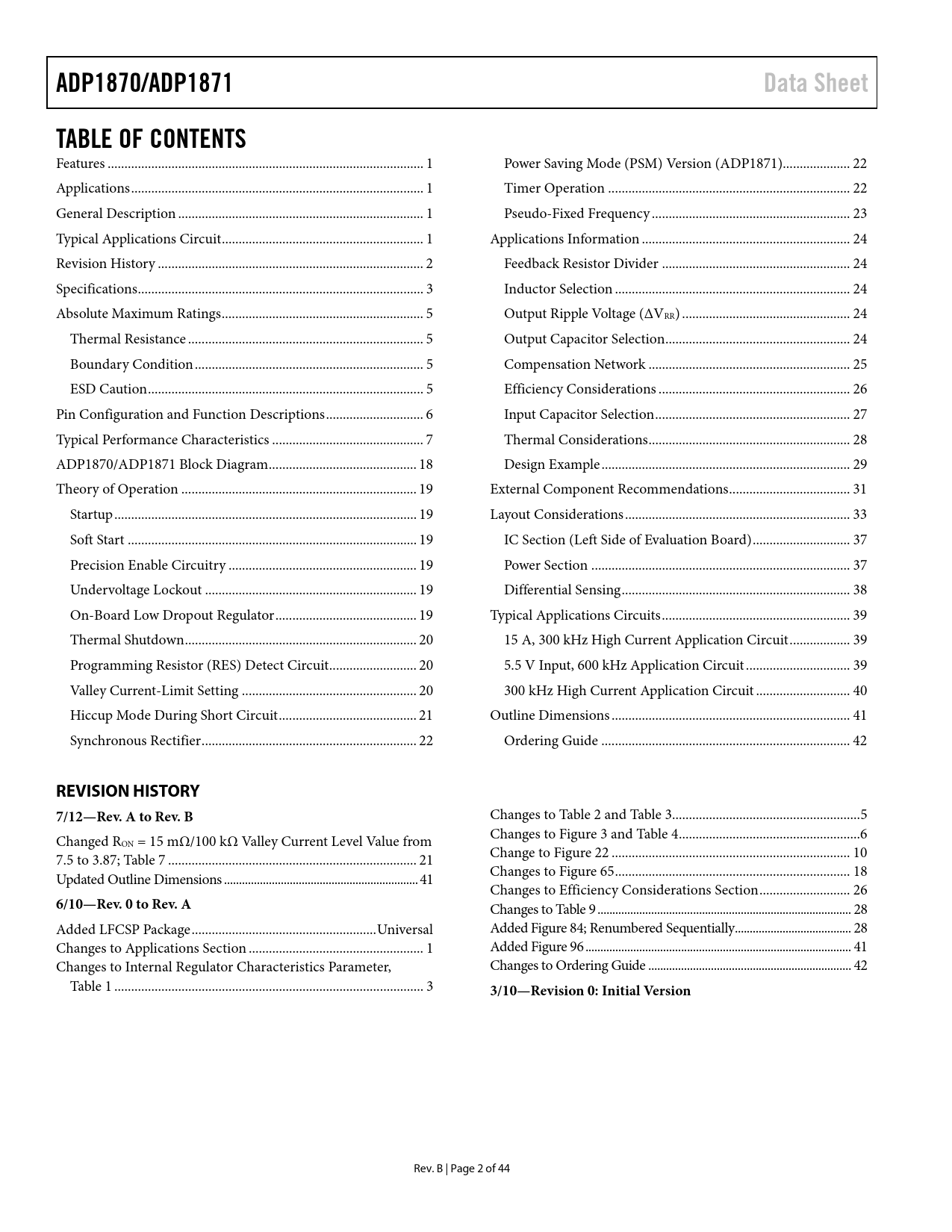 link to page 1 link to page 1 link to page 1 link to page 1 link to page 2 link to page 3 link to page 5 link to page 5 link to page 5 link to page 5 link to page 6 link to page 7 link to page 18 link to page 19 link to page 19 link to page 19 link to page 19 link to page 19 link to page 19 link to page 20 link to page 20 link to page 20 link to page 21 link to page 22 link to page 22 link to page 22 link to page 23 link to page 24 link to page 24 link to page 24 link to page 24 link to page 24 link to page 25 link to page 26 link to page 27 link to page 28 link to page 29 link to page 31 link to page 33 link to page 37 link to page 37 link to page 38 link to page 39 link to page 39 link to page 39 link to page 40 link to page 41 link to page 42 ADP1870/ADP1871Data SheetTABLE OF CONTENTS Features .. 1 Power Saving Mode (PSM) Version (ADP1871).. 22 Applications ... 1 Timer Operation .. 22 General Description ... 1 Pseudo-Fixed Frequency ... 23 Typical Applications Circuit .. 1 Applications Information .. 24 Revision History ... 2 Feedback Resistor Divider .. 24 Specifications ... 3 Inductor Selection .. 24 Absolute Maximum Ratings .. 5 Output Ripple Voltage (ΔVRR) .. 24 Thermal Resistance .. 5 Output Capacitor Selection... 24 Boundary Condition .. 5 Compensation Network .. 25 ESD Caution .. 5 Efficiency Considerations ... 26 Pin Configuration and Function Descriptions ... 6 Input Capacitor Selection .. 27 Typical Performance Characteristics ... 7 Thermal Considerations .. 28 ADP1870/ADP1871 Block Diagram .. 18 Design Example .. 29 Theory of Operation .. 19 External Component Recommendations .. 31 Startup .. 19 Layout Considerations ... 33 Soft Start .. 19 IC Section (Left Side of Evaluation Board) ... 37 Precision Enable Circuitry .. 19 Power Section ... 37 Undervoltage Lockout ... 19 Differential Sensing .. 38 On-Board Low Dropout Regulator .. 19 Typical Applications Circuits .. 39 Thermal Shutdown ... 20 15 A, 300 kHz High Current Application Circuit .. 39 Programming Resistor (RES) Detect Circuit .. 20 5.5 V Input, 600 kHz Application Circuit ... 39 Valley Current-Limit Setting .. 20 300 kHz High Current Application Circuit .. 40 Hiccup Mode During Short Circuit ... 21 Outline Dimensions ... 41 Synchronous Rectifier .. 22 Ordering Guide .. 42 REVISION HISTORY 7/12—Rev. A to Rev. B Changes to Table 2 and Table 3.. 5 Changed R Changes to Figure 3 and Table 4 .. 6 ON = 15 mΩ/100 kΩ Val ey Current Level Value from 7.5 to 3.87; Table 7 .. 21 Change to Figure 22 ... 10 Updated Outline Dimensions . ... .. ... ... ... ... ... ... ... ... ... ... .. .. 41 Changes to Figure 65 .. 18 Changes to Efficiency Considerations Section ... 26 6/10—Rev. 0 to Rev. A Changes to Table 9 . ... .. ... ... ... ... ... ... ... ... ... .. .. ... ... ... ... 28 Added LFCSP Package ... Universal Added Figure 84; Renumbered Sequentially.. ... ... ... ... .. .. .. 28 Changes to Applications Section .. 1 Added Figure 96 . ... .. ... ... ... ... ... ... ... ... ... .. .. .. .. ... ... ... 41 Changes to Internal Regulator Characteristics Parameter, Changes to Ordering Guide .. ... ... ... .. .. .. .. ... ... ... ... ... ... 42 Table 1 .. 3 3/10—Revision 0: Initial Version Rev. B | Page 2 of 44 Document Outline Features Applications General Description Typical Applications Circuit Revision History Specifications Absolute Maximum Ratings Thermal Resistance Boundary Condition ESD Caution Pin Configuration and Function Descriptions Typical Performance Characteristics ADP1870/ADP1871 Block Diagram Theory of Operation Startup Soft Start Precision Enable Circuitry Undervoltage Lockout On-Board Low Dropout Regulator Thermal Shutdown Programming Resistor (RES) Detect Circuit Valley Current-Limit Setting Hiccup Mode During Short Circuit Synchronous Rectifier Power Saving Mode (PSM) Version (ADP1871) Timer Operation Pseudo-Fixed Frequency Applications Information Feedback Resistor Divider Inductor Selection Output Ripple Voltage (ΔVRR) Output Capacitor Selection Compensation Network Output Filter Impedance (ZFILT) Error Amplifier Output Impedance (ZCOMP) Error Amplifier Gain (GM) Current-Sense Loop Gain (GCS) Crossover Frequency Efficiency Considerations Channel Conduction Loss MOSFET Driver Loss Switching Loss Diode Conduction Loss Inductor Loss Input Capacitor Selection Thermal Considerations Design Example Input Capacitor Inductor Current Limit Programming Output Capacitor Feedback Resistor Network Setup Compensation Network Loss Calculations External Component Recommendations Layout Considerations IC Section (Left Side of Evaluation Board) Power Section Differential Sensing Typical Applications Circuits 15 A, 300 kHz High Current Application Circuit 5.5 V Input, 600 kHz Application Circuit 300 kHz High Current Application Circuit Outline Dimensions Ordering Guide