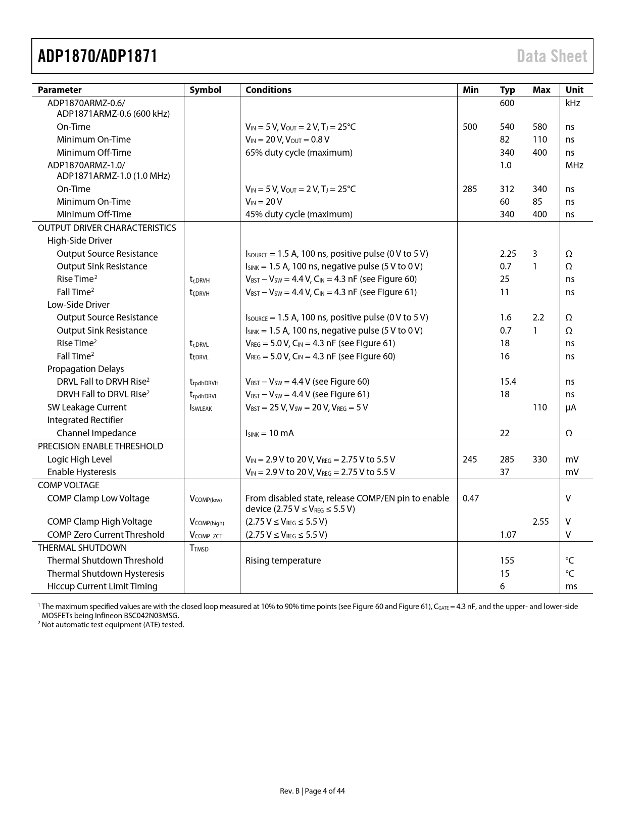 link to page 16 link to page 16 link to page 16 link to page 16 link to page 16 link to page 16 link to page 16 link to page 16 link to page 4 link to page 4 link to page 4 link to page 4 link to page 4 link to page 4 ADP1870/ADP1871Data SheetParameterSymbolConditionsMinTypMaxUnit ADP1870ARMZ-0.6/ 600 kHz ADP1871ARMZ-0.6 (600 kHz) On-Time VIN = 5 V, VOUT = 2 V, TJ = 25°C 500 540 580 ns Minimum On-Time VIN = 20 V, VOUT = 0.8 V 82 110 ns Minimum Off-Time 65% duty cycle (maximum) 340 400 ns ADP1870ARMZ-1.0/ 1.0 MHz ADP1871ARMZ-1.0 (1.0 MHz) On-Time VIN = 5 V, VOUT = 2 V, TJ = 25°C 285 312 340 ns Minimum On-Time VIN = 20 V 60 85 ns Minimum Off-Time 45% duty cycle (maximum) 340 400 ns OUTPUT DRIVER CHARACTERISTICS High-Side Driver Output Source Resistance ISOURCE = 1.5 A, 100 ns, positive pulse (0 V to 5 V) 2.25 3 Ω Output Sink Resistance ISINK = 1.5 A, 100 ns, negative pulse (5 V to 0 V) 0.7 1 Ω Rise Time2 tr,DRVH VBST − VSW = 4.4 V, CIN = 4.3 nF (see Figure 60) 25 ns Fall Time2 tf,DRVH VBST − VSW = 4.4 V, CIN = 4.3 nF (see Figure 61) 11 ns Low-Side Driver Output Source Resistance ISOURCE = 1.5 A, 100 ns, positive pulse (0 V to 5 V) 1.6 2.2 Ω Output Sink Resistance ISINK = 1.5 A, 100 ns, negative pulse (5 V to 0 V) 0.7 1 Ω Rise Time2 tr,DRVL VREG = 5.0 V, CIN = 4.3 nF (see Figure 61) 18 ns Fall Time2 tf,DRVL VREG = 5.0 V, CIN = 4.3 nF (see Figure 60) 16 ns Propagation Delays DRVL Fall to DRVH Rise2 ttpdhDRVH VBST − VSW = 4.4 V (see Figure 60) 15.4 ns DRVH Fall to DRVL Rise2 ttpdhDRVL VBST − VSW = 4.4 V (see Figure 61) 18 ns SW Leakage Current ISWLEAK VBST = 25 V, VSW = 20 V, VREG = 5 V 110 µA Integrated Rectifier Channel Impedance ISINK = 10 mA 22 Ω PRECISION ENABLE THRESHOLD Logic High Level VIN = 2.9 V to 20 V, VREG = 2.75 V to 5.5 V 245 285 330 mV Enable Hysteresis VIN = 2.9 V to 20 V, VREG = 2.75 V to 5.5 V 37 mV COMP VOLTAGE COMP Clamp Low Voltage VCOMP(low) From disabled state, release COMP/EN pin to enable 0.47 V device (2.75 V ≤ VREG ≤ 5.5 V) COMP Clamp High Voltage VCOMP(high) (2.75 V ≤ VREG ≤ 5.5 V) 2.55 V COMP Zero Current Threshold VCOMP_ZCT (2.75 V ≤ VREG ≤ 5.5 V) 1.07 V THERMAL SHUTDOWN TTMSD Thermal Shutdown Threshold Rising temperature 155 °C Thermal Shutdown Hysteresis 15 °C Hiccup Current Limit Timing 6 ms 1 The maximum specified values are with the closed loop measured at 10% to 90% time points (see Figure 60 and Figure 61), CGATE = 4.3 nF, and the upper- and lower-side MOSFETs being Infineon BSC042N03MSG. 2 Not automatic test equipment (ATE) tested. Rev. B | Page 4 of 44 Document Outline Features Applications General Description Typical Applications Circuit Revision History Specifications Absolute Maximum Ratings Thermal Resistance Boundary Condition ESD Caution Pin Configuration and Function Descriptions Typical Performance Characteristics ADP1870/ADP1871 Block Diagram Theory of Operation Startup Soft Start Precision Enable Circuitry Undervoltage Lockout On-Board Low Dropout Regulator Thermal Shutdown Programming Resistor (RES) Detect Circuit Valley Current-Limit Setting Hiccup Mode During Short Circuit Synchronous Rectifier Power Saving Mode (PSM) Version (ADP1871) Timer Operation Pseudo-Fixed Frequency Applications Information Feedback Resistor Divider Inductor Selection Output Ripple Voltage (ΔVRR) Output Capacitor Selection Compensation Network Output Filter Impedance (ZFILT) Error Amplifier Output Impedance (ZCOMP) Error Amplifier Gain (GM) Current-Sense Loop Gain (GCS) Crossover Frequency Efficiency Considerations Channel Conduction Loss MOSFET Driver Loss Switching Loss Diode Conduction Loss Inductor Loss Input Capacitor Selection Thermal Considerations Design Example Input Capacitor Inductor Current Limit Programming Output Capacitor Feedback Resistor Network Setup Compensation Network Loss Calculations External Component Recommendations Layout Considerations IC Section (Left Side of Evaluation Board) Power Section Differential Sensing Typical Applications Circuits 15 A, 300 kHz High Current Application Circuit 5.5 V Input, 600 kHz Application Circuit 300 kHz High Current Application Circuit Outline Dimensions Ordering Guide