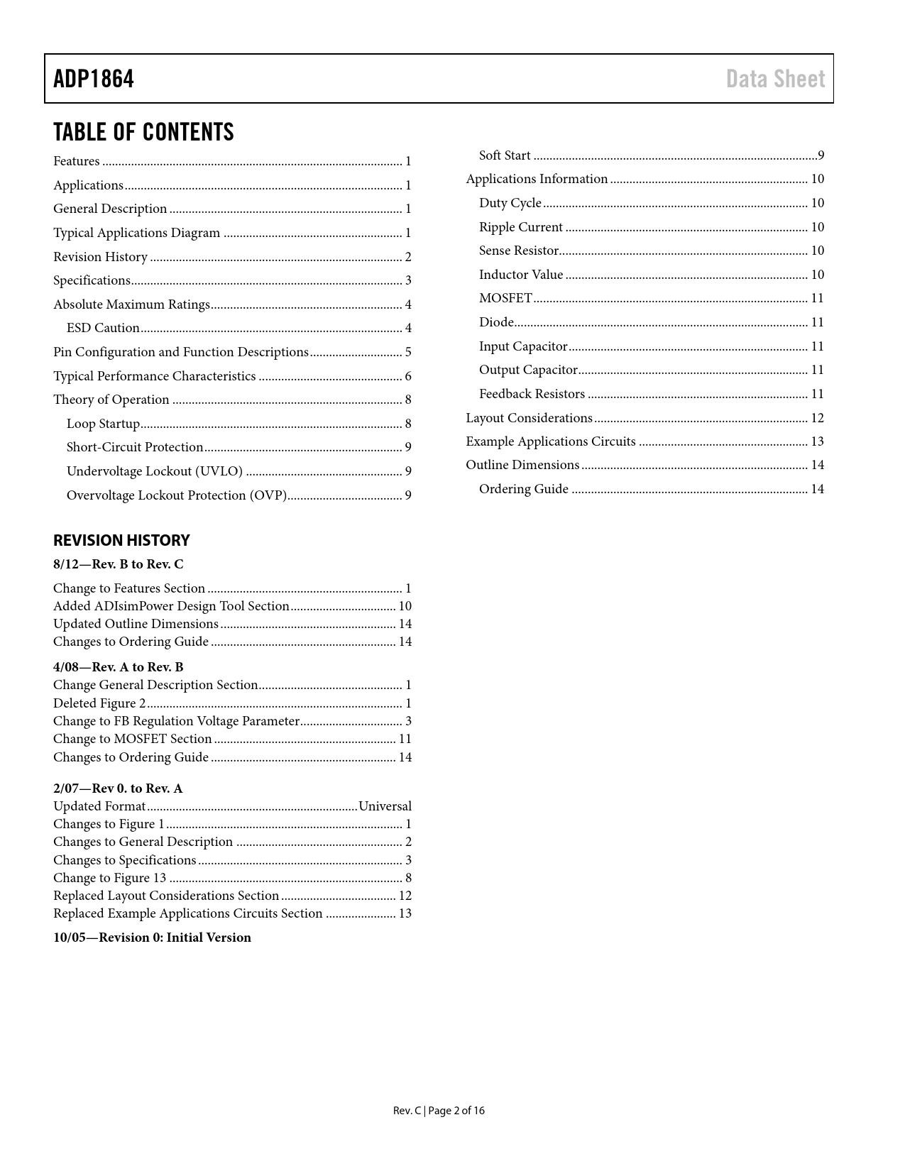 ADP1864 Data Sheet TABLE OF CONTENTS REVISION HISTORY 8/12—Rev B to Rev C 4/08—Rev A to Rev B 2/07—Rev 0 to Rev A