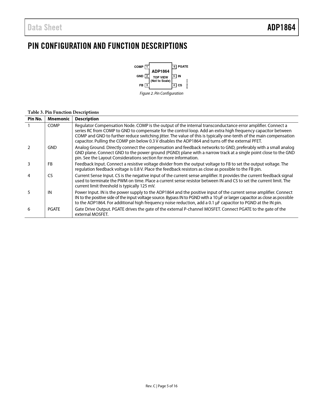 link to page 12 Data SheetADP1864PIN CONFIGURATION AND FUNCTION DESCRIPTIONSCOMP16PGATEADP1864GND2TOP VIEW5IN(Not to Scale) 003 FB34CS 05562- Figure 2. Pin Configuration Table 3. Pin Function Descriptions Pin No. Mnemonic Description 1 COMP Regulator Compensation Node. COMP is the output of the internal transconductance error amplifier. Connect a series RC from COMP to GND to compensate for the control loop. Add an extra high frequency capacitor between COMP and GND to further reduce switching jitter. The value of this is typically one-tenth of the main compensation capacitor. Pulling the COMP pin below 0.3 V disables the ADP1864 and turns off the external PFET. 2 GND Analog Ground. Directly connect the compensation and feedback networks to GND, preferably with a small analog GND plane. Connect GND to the power ground (PGND) plane with a narrow track at a single point close to the GND pin. See the Layout Considerations section for more information. 3 FB Feedback Input. Connect a resistive voltage divider from the output voltage to FB to set the output voltage. The regulation feedback voltage is 0.8 V. Place the feedback resistors as close as possible to the FB pin. 4 CS Current Sense Input. CS is the negative input of the current sense amplifier. It provides the current feedback signal used to terminate the PWM on time. Place a current sense resistor between IN and CS to set the current limit. The current limit threshold is typically 125 mV. 5 IN Power Input. IN is the power supply to the ADP1864 and the positive input of the current sense amplifier. Connect IN to the positive side of the input voltage source. Bypass IN to PGND with a 10 μF or larger capacitor as close as possible to the ADP1864. For additional high frequency noise reduction, add a 0.1 μF capacitor to PGND at the IN pin. 6 PGATE Gate Drive Output. PGATE drives the gate of the external P-channel MOSFET. Connect PGATE to the gate of the external MOSFET. Rev. C | Page 5 of 16 Document Outline Features Applications General Description Typical Applications Diagram Revision History Specifications Absolute Maximum Ratings ESD Caution Pin Configuration and Function Descriptions Typical Performance Characteristics Theory of Operation Loop Startup Short-Circuit Protection Undervoltage Lockout (UVLO) Overvoltage Lockout Protection (OVP) Soft Start Applications Information ADIsimPower Design Tool Duty Cycle Ripple Current Sense Resistor Inductor Value MOSFET Diode Input Capacitor Output Capacitor Feedback Resistors Layout Considerations Example Applications Circuits Outline Dimensions Ordering Guide