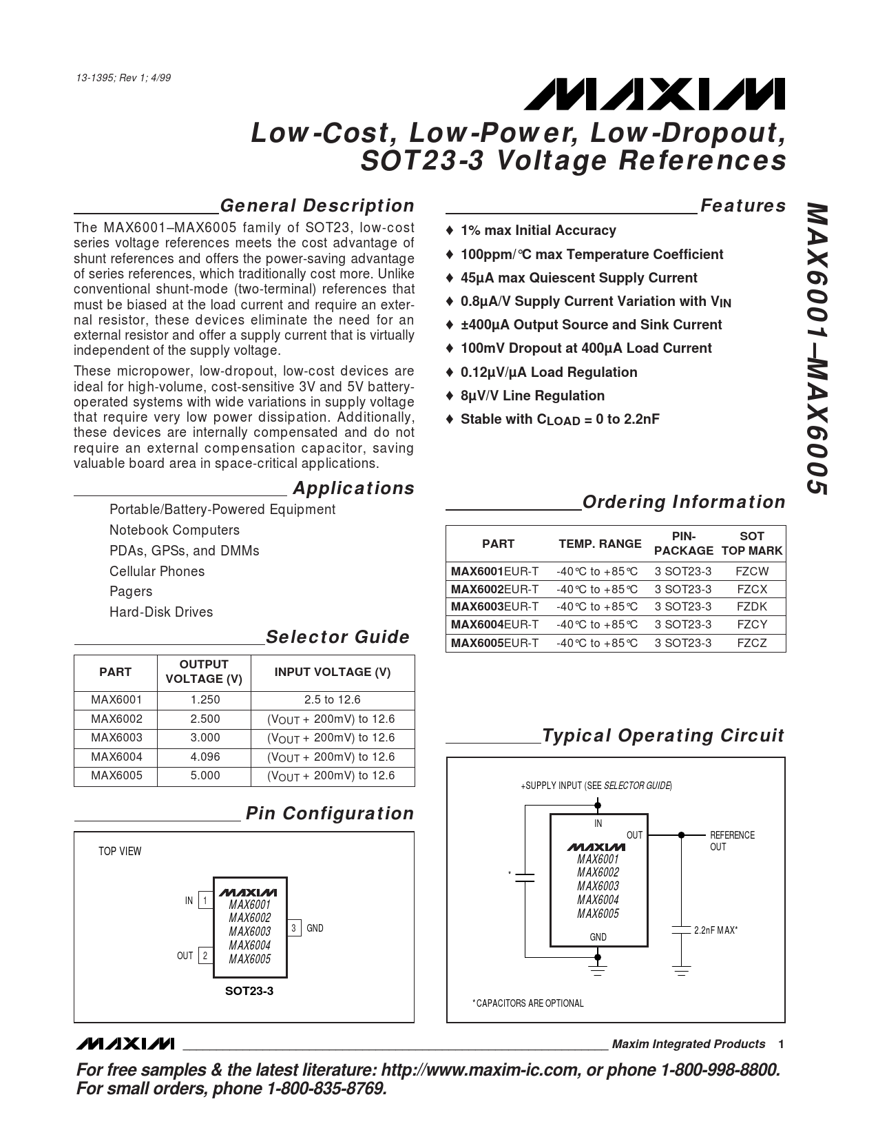 13-1395; Rev 1; 4/99 Low-Cost, Low-Power, Low-Dropout,SOT23-3 Voltage ReferencesMAX6001–MAX6005General DescriptionFeatures The MAX6001–MAX6005 family of SOT23, low-cost ♦ 1% max Initial Accuracy series voltage references meets the cost advantage of shunt references and offers the power-saving advantage ♦ 100ppm/°C max Temperature Coefficient of series references, which traditionally cost more. Unlike ♦ 45µA max Quiescent Supply Current conventional shunt-mode (two-terminal) references that must be biased at the load current and require an exter- ♦ 0.8µA/V Supply Current Variation with VIN nal resistor, these devices eliminate the need for an ♦ ±400µA Output Source and Sink Current external resistor and offer a supply current that is virtually independent of the supply voltage. ♦ 100mV Dropout at 400µA Load Current These micropower, low-dropout, low-cost devices are ♦ 0.12µV/µA Load Regulation ideal for high-volume, cost-sensitive 3V and 5V battery- ♦ operated systems with wide variations in supply voltage 8µV/V Line Regulation that require very low power dissipation. Additionally, ♦ Stable with CLOAD = 0 to 2.2nF these devices are internally compensated and do not require an external compensation capacitor, saving valuable board area in space-critical applications. ApplicationsOrdering Information Portable/Battery-Powered Equipment Notebook Computers PIN-SOTPARTTEMP. RANGE PDAs, GPSs, and DMMs PACKAGE TOP MARK Cellular Phones MAX6001 EUR-T -40°C to +85°C 3 SOT23-3 FZCW Pagers MAX6002 EUR-T -40°C to +85°C 3 SOT23-3 FZCX Hard-Disk Drives MAX6003 EUR-T -40°C to +85°C 3 SOT23-3 FZDK MAX6004 EUR-T -40°C to +85°C 3 SOT23-3 FZCY Selector GuideMAX6005 EUR-T -40°C to +85°C 3 SOT23-3 FZCZ OUTPUTPARTINPUT VOLTAGE (V)VOLTAGE (V) MAX6001 1.250 2.5 to 12.6 MAX6002 2.500 (VOUT + 200mV) to 12.6 MAX6003 3.000 (VOUT + 200mV) to 12.6 Typical Operating Circuit MAX6004 4.096 (VOUT + 200mV) to 12.6 MAX6005 5.000 (VOUT + 200mV) to 12.6 +SUPPLY INPUT (SEE SELECTOR GUIDE) Pin Configuration IN OUT REFERENCE OUT TOP VIEW MAX6001 * MAX6002 MAX6003 IN 1 MAX6004 MAX6001 MAX6005 MAX6002 3 GND 2.2nF MAX* MAX6003 GND MAX6004 OUT 2 MAX6005 SOT23-3 *CAPACITORS ARE OPTIONAL ________________________________________________________________ Maxim Integrated Products1For free samples & the latest literature: http://www.maxim-ic.com, or phone 1-800-998-8800. For small orders, phone 1-800-835-8769.