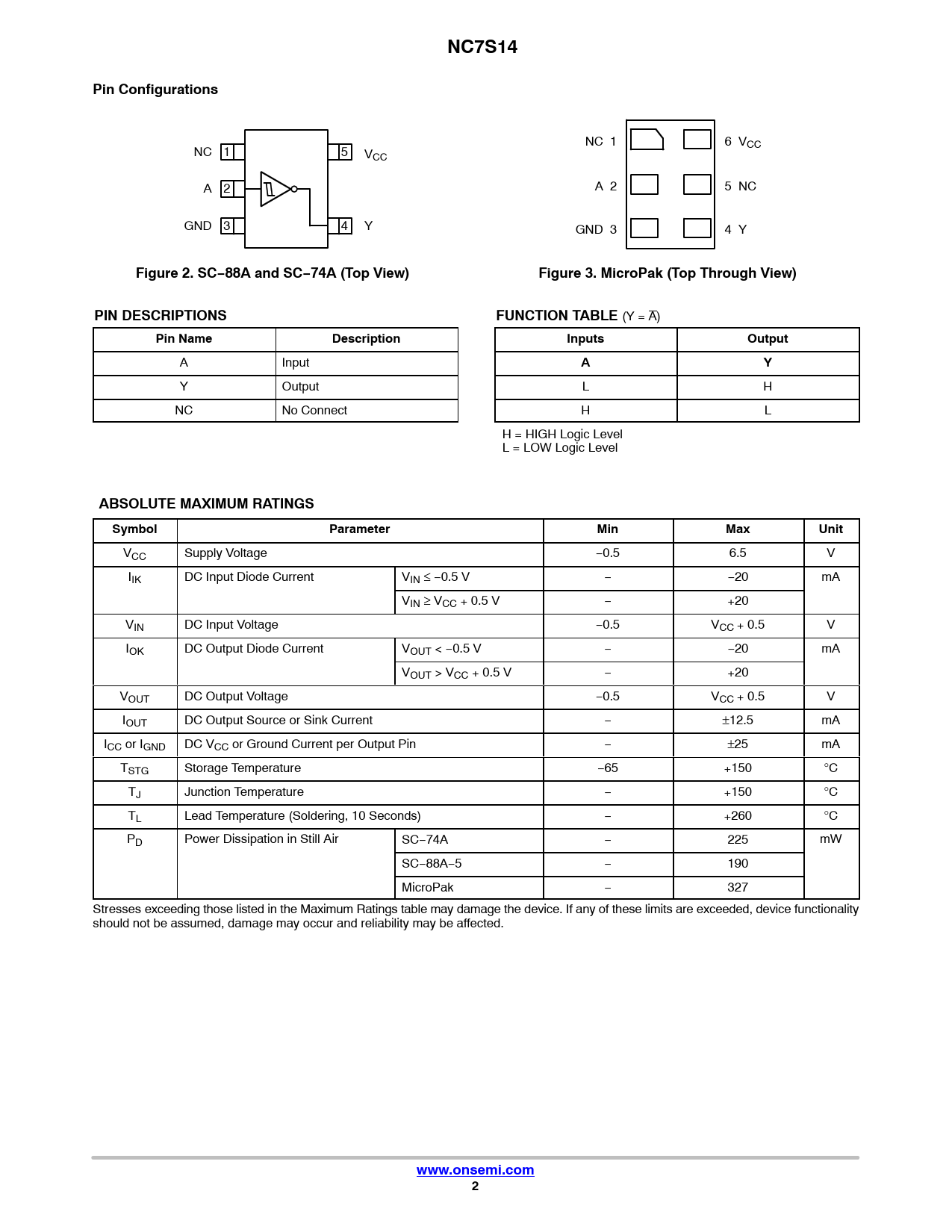 NC7S14Pin Configurations NC 1 6 V NC 1 5 CC VCC A 2 A 2 5 NC GND 3 4 Y GND 3 4 Y Figure 2. SC−88A and SC−74A (Top View)Figure 3. MicroPak (Top Through View)PIN DESCRIPTIONSFUNCTION TABLE (Y = A) Pin NameDescriptionInputsOutput A Input AY Y Output L H NC No Connect H L H = HIGH Logic Level L = LOW Logic Level ABSOLUTE MAXIMUM RATINGSSymbolParameterMinMaxUnit VCC Supply Voltage −0.5 6.5 V IIK DC Input Diode Current VIN ≤ −0.5 V − −20 mA VIN ≥ VCC + 0.5 V − +20 VIN DC Input Voltage −0.5 VCC + 0.5 V IOK DC Output Diode Current VOUT < −0.5 V − −20 mA VOUT > VCC + 0.5 V − +20 VOUT DC Output Voltage −0.5 VCC + 0.5 V IOUT DC Output Source or Sink Current − ±12.5 mA ICC or IGND DC VCC or Ground Current per Output Pin − ±25 mA TSTG Storage Temperature −65 +150 °C TJ Junction Temperature − +150 °C TL Lead Temperature (Soldering, 10 Seconds) − +260 °C PD Power Dissipation in Still Air SC−74A − 225 mW SC−88A−5 − 190 MicroPak − 327 Stresses exceeding those listed in the Maximum Ratings table may damage the device. If any of these limits are exceeded, device functionality should not be assumed, damage may occur and reliability may be affected. www.onsemi.com2