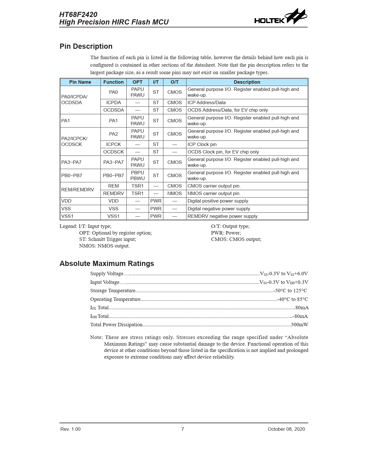 HT68F2420HT68F2420High Precision HIRC Flash MCUHigh Precision HIRC Flash MCUPin Description The function of each pin is listed in the following table, however the details behind how each pin is configured is contained in other sections of the datasheet. Note that the pin description refers to the largest package size, as a result some pins may not exist on smaller package types. Pin NameFunctionOPTI/TO/TDescription PA0 PAPU PA0/ICPDA/ PAWU ST CMOS General purpose I/O. Register enabled pull-high and wake-up. OCDSDA ICPDA — ST CMOS ICP Address/Data OCDSDA — ST CMOS OCDS Address/Data, for EV chip only PA1 PA1 PAPU PAWU ST CMOS General purpose I/O. Register enabled pull-high and wake-up. PA2 PAPU PA2/ICPCK/ PAWU ST CMOS General purpose I/O. Register enabled pull-high and wake-up. OCDSCK ICPCK — ST — ICP Clock pin OCDSCK — ST — OCDS Clock pin, for EV chip only PA3~PA7 PA3~PA7 PAPU PAWU ST CMOS General purpose I/O. Register enabled pull-high and wake-up. PB0~PB7 PB0~PB7 PBPU PBWU ST CMOS General purpose I/O. Register enabled pull-high and wake-up. REM TSR1 — CMOS CMOS carrier output pin. REM/REMDRV REMDRV TSR1 — NMOS NMOS carrier output pin. VDD VDD — PWR — Digital positive power supply. VSS VSS — PWR — Digital negative power supply. VSS1 VSS1 — PWR — REMDRV negative power supply. Legend: I/T: Input type; O/T: Output type; OPT: Optional by register option; PWR: Power; ST: Schmitt Trigger input; CMOS: CMOS output; NMOS: NMOS output. Absolute Maximum Ratings Supply Voltage…...VSS-0.3V to VSS+6.0V Input Voltage…..VSS-0.3V to VDD+0.3V Storage Temperature..-50°C to 125°C Operating Temperature...-40°C to 85°C IOL Total..80mA IOH Total..-80mA Total Power Dissipation. 500mW Note: These are stress ratings only. Stresses exceeding the range specified under “Absolute Maximum Ratings” may cause substantial damage to the device. Functional operation of this device at other conditions beyond those listed in the specification is not implied and prolonged exposure to extreme conditions may affect device reliability. Rev. 1.00 6 October 08, 2020 Rev. 1.00 7 October 08, 2020 Document Outline Features CPU Features Peripheral Features General Description Block Diagram Pin Assignment Pin Description Absolute Maximum Ratings D.C. Characteristics Operating Voltage Characteristics Operating Current Characteristics Standby Current Characteristics A.C. Characteristics Internal Oscillator Characteristics System Start Up Time Characteristics Input/Output Characteristics REM/REMDRV Pin Characteristics LVR Electrical Characteristics Power on Reset Characteristics System Architecture Clocking and Pipelining Program Counter Stack Arithmetic and Logic Unit – ALU Flash Program Memory Structure Special Vectors Look-up Table Table Program Example In Circuit Programming – ICP On-Chip Debug Support – OCDS Data Memory Structure General Purpose Data Memory Special Purpose Data Memory Special Function Register Description Indirect Addressing Registers – IAR0 Memory Pointers – MP0 Accumulator – ACC Program Counter Low Register – PCL Look-up Table Registers – TBLP, TBLH Status Register – STATUS Oscillators Oscillator Overview System Clock Configurations Internal RC Oscillator – HIRC Internal 32kHz Oscillator – LIRC Operating Modes and System Clocks System Clocks System Operation Modes Control Register Operating Mode Switching Standby Current Considerations Wake-up Watchdog Timer Watchdog Timer Clock Source Watchdog Timer Control Register Watchdog Timer Operation Reset and Initialisation Reset Functions Reset Initial Conditions Input/Output Ports Pull-high Resistors I/O Pin Wake-up I/O Port Control Registers I/O Pin Structures Programming Considerations 9-bit Timer with Carrier Output Timer and Carrier Output Conctrol Register Timer Operation Carrier Output Carrier Output Pins Interrupts Interrupt Register Interrupt Operation Time Base Interrupt Interrupt Wake-up Function Programming Considerations Application Circuits Instruction Set Introduction Instruction Timing Moving and Transferring Data Arithmetic Operations Logical and Rotate Operation Branches and Control Transfer Bit Operations Table Read Operations Other Operations Instruction Set Summary Table Conventions Instruction Definition Package Information 8-pin SOP (150mil) Outline Dimensions 16-pin NSOP (150mil) Outline Dimensions 20-pin NSOP (150mil) Outline Dimensions 20-pin SSOP (150mil) Outline Dimensions