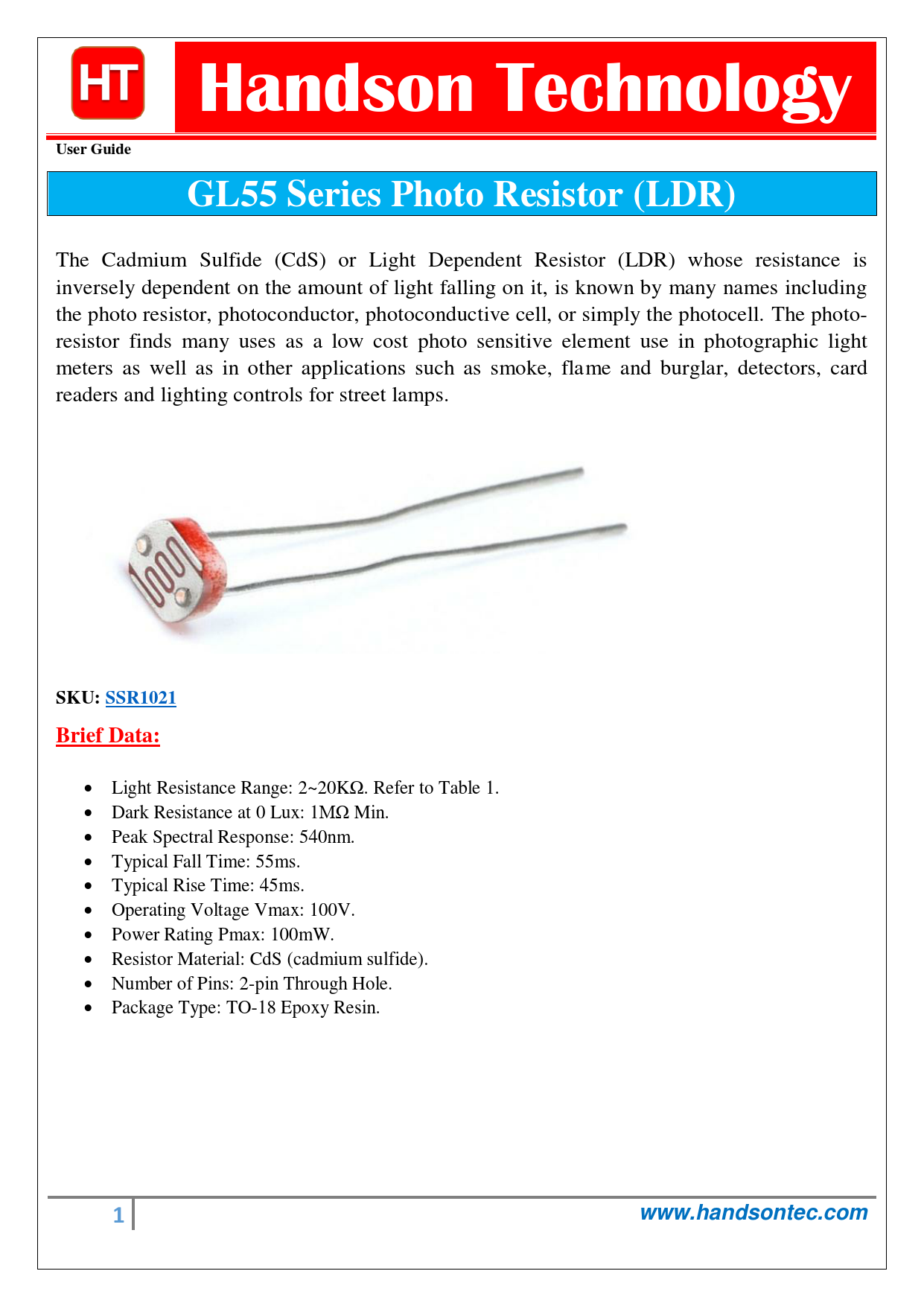 Handson TechnologyUser GuideGL55 Series Photo Resistor (LDR) The Cadmium Sulfide (CdS) or Light Dependent Resistor (LDR) whose resistance is inversely dependent on the amount of light falling on it, is known by many names including the photo resistor, photoconductor, photoconductive cell, or simply the photocell. The photo- resistor finds many uses as a low cost photo sensitive element use in photographic light meters as well as in other applications such as smoke, flame and burglar, detectors, card readers and lighting controls for street lamps. SKU: SSR1021Brief Data: Light Resistance Range: 2~20KΩ. Refer to Table 1. Dark Resistance at 0 Lux: 1MΩ Min. Peak Spectral Response: 540nm. Typical Fall Time: 55ms. Typical Rise Time: 45ms. Operating Voltage Vmax: 100V. Power Rating Pmax: 100mW. Resistor Material: CdS (cadmium sulfide). Number of Pins: 2-pin Through Hole. Package Type: TO-18 Epoxy Resin. 1www.handsontec.com