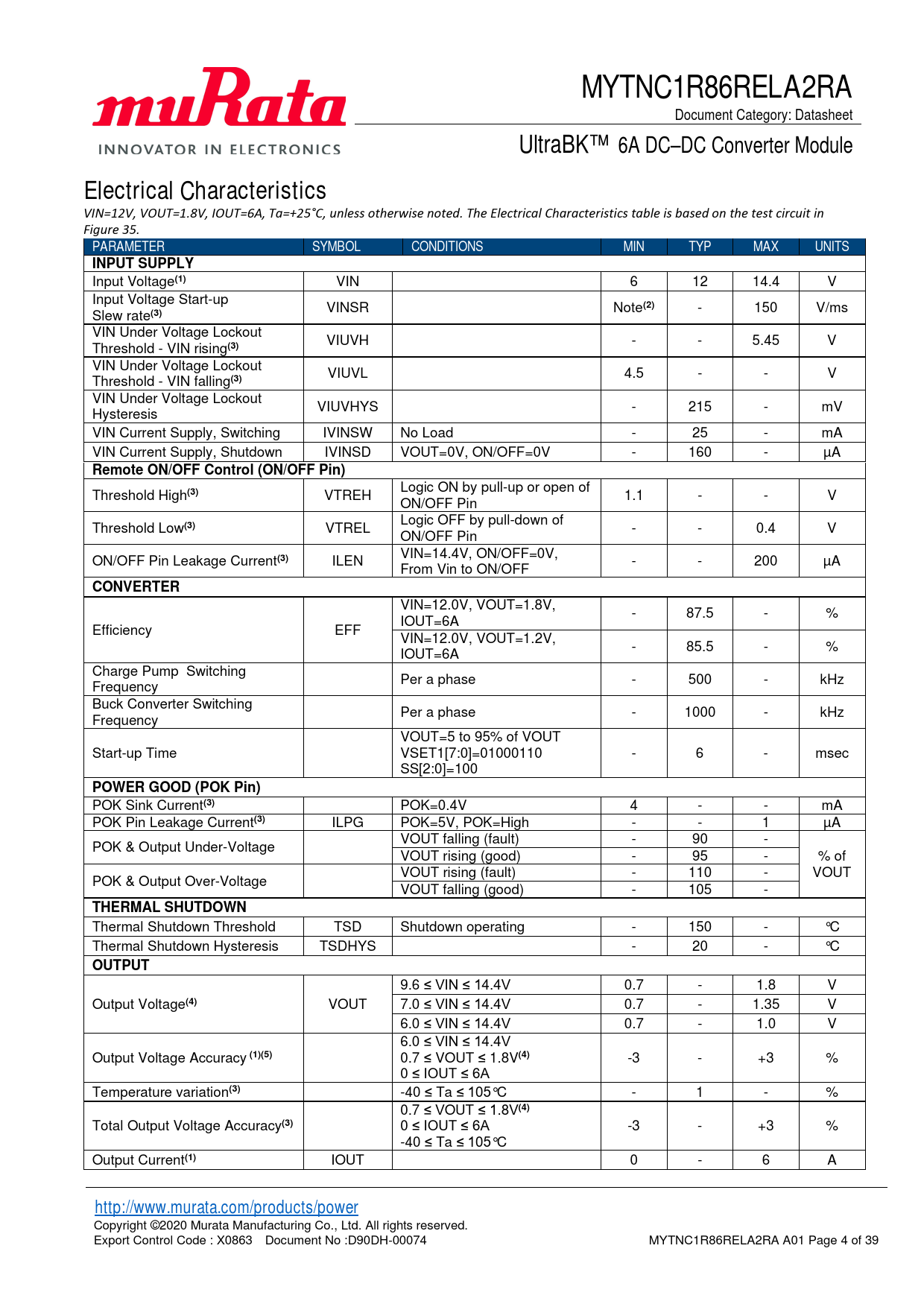 Copyright ©2020 Murata Manufacturing Co., Ltd. All rights reserved. Export Control Code : X0863 Document No :D90DH-00074 MYTNC1R86RELA2RA A01 Page 4 of 39 Document Outline Product Description Features Typical Applications Efficiency Simplified Application Circuit Absolute Maximum Ratings(1)(2) Recommended Operating Conditions(1) Package Thermal Characteristics(1)(2) Electrical Characteristics Pin Configuration Pin Descriptions Functional Block Diagram Typical Performance Characteristics Thermal Deratings (Reference Data) Output Voltage Range Limitation of Input Voltage Slew rate Detailed Description Output Voltage Remote Sense Function Remote Enable Function Soft start Function Power Good Operation Telemetry System I2C Interface Bus Overview Standard-, Fast-, Fast-Mode Plus Protocol I2C Update Sequence Register Map Detailed Register Description Protections Over Current Protection and Short Circuit Protection Over Temperature Protection Soldering Guidelines Pb-free Solder Processes Dry Pack Information Application Performance Transient Performance Test Circuit Component Selection Input Fuse Input Capacitor Output Capacitor Packaging Information Moisture Sensitivity Level Package Drawing Recommended Board Land Pattern (Top View) Top Marking Specification Application Circuit Application Circuit Part List (Recommended) Application Board Example Tape and Reel Specification Order Codes Notices CAUTION Limitation of Applications Note Product Specification Sales contact Disclaimers Patent Statement Copyright and Trademark
