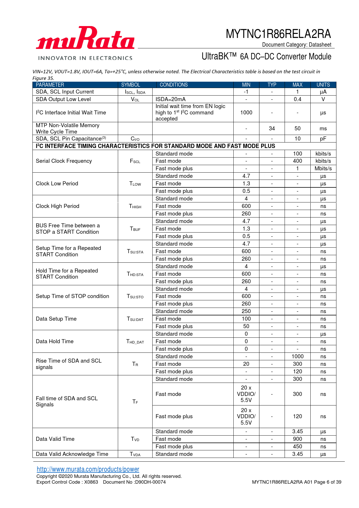 Copyright ©2020 Murata Manufacturing Co., Ltd. All rights reserved. Export Control Code : X0863 Document No :D90DH-00074 MYTNC1R86RELA2RA A01 Page 6 of 39 Document Outline Product Description Features Typical Applications Efficiency Simplified Application Circuit Absolute Maximum Ratings(1)(2) Recommended Operating Conditions(1) Package Thermal Characteristics(1)(2) Electrical Characteristics Pin Configuration Pin Descriptions Functional Block Diagram Typical Performance Characteristics Thermal Deratings (Reference Data) Output Voltage Range Limitation of Input Voltage Slew rate Detailed Description Output Voltage Remote Sense Function Remote Enable Function Soft start Function Power Good Operation Telemetry System I2C Interface Bus Overview Standard-, Fast-, Fast-Mode Plus Protocol I2C Update Sequence Register Map Detailed Register Description Protections Over Current Protection and Short Circuit Protection Over Temperature Protection Soldering Guidelines Pb-free Solder Processes Dry Pack Information Application Performance Transient Performance Test Circuit Component Selection Input Fuse Input Capacitor Output Capacitor Packaging Information Moisture Sensitivity Level Package Drawing Recommended Board Land Pattern (Top View) Top Marking Specification Application Circuit Application Circuit Part List (Recommended) Application Board Example Tape and Reel Specification Order Codes Notices CAUTION Limitation of Applications Note Product Specification Sales contact Disclaimers Patent Statement Copyright and Trademark