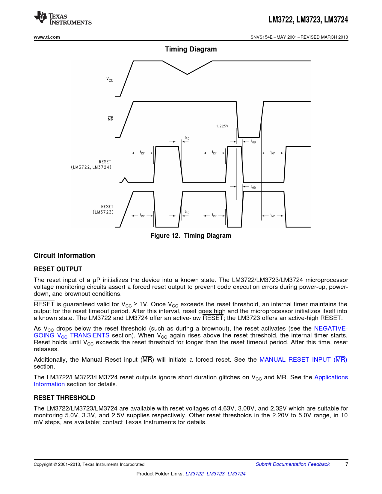 LM3722. , LM3723,. LM3724. www.ti.com. Timing Diagram. Figure 12. Timing Diagram. Circuit Information. RESET OUTPUT. RESET THRESHOLD
