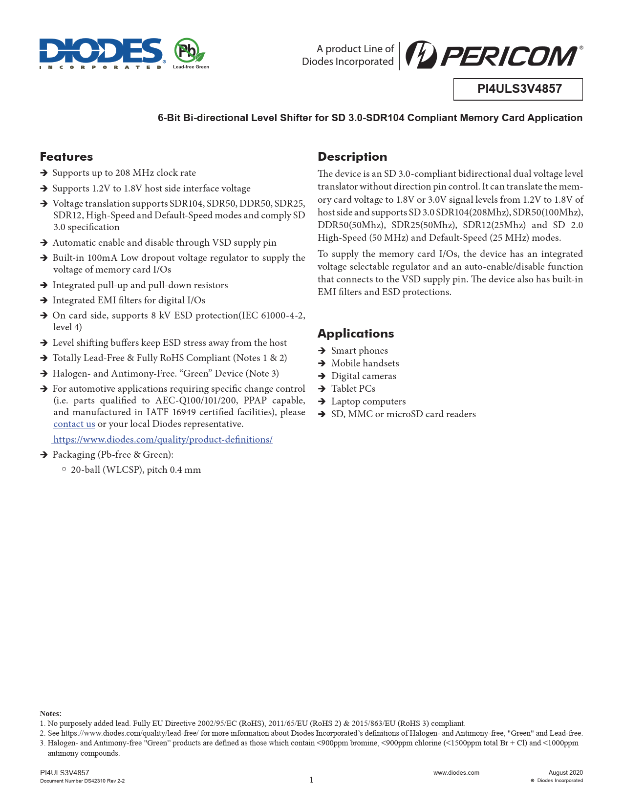 A product Line of bP Diodes Incorporated Lead-free GreenPI4ULS3V48576-Bit Bi-directional Level Shifter for SD 3.0-SDR104 Compliant Memory Card ApplicationFeaturesDescription ÎÎSupports up to 208 MHz clock rate The device is an SD 3.0-compliant bidirectional dual voltage level ÎÎSupports 1.2V to 1.8V host side interface voltage translator without direction pin control. It can translate the mem- ory card voltage to 1.8V or 3.0V signal levels from 1.2V to 1.8V of ÎÎVoltage translation supports SDR104, SDR50, DDR50, SDR25, SDR12, High-Speed and Default-Speed modes and comply SD host side and supports SD 3.0 SDR104(208Mhz), SDR50(100Mhz), 3.0 specification DDR50(50Mhz), SDR25(50Mhz), SDR12(25Mhz) and SD 2.0 High-Speed (50 MHz) and Default-Speed (25 MHz) modes. ÎÎAutomatic enable and disable through VSD supply pin ÎÎBuilt-in 100mA Low dropout voltage regulator to supply the To supply the memory card I/Os, the device has an integrated voltage of memory card I/Os voltage selectable regulator and an auto-enable/disable function that connects to the VSD supply pin. The device also has built-in ÎÎIntegrated pull-up and pull-down resistors EMI filters and ESD protections. ÎÎIntegrated EMI filters for digital I/Os ÎÎOn card side, supports 8 kV ESD protection(IEC 61000-4-2, level 4) Applications ÎÎLevel shifting buffers keep ESD stress away from the host ÎÎSmart phones ÎÎTotally Lead-Free & Fully RoHS Compliant (Notes 1 & 2) ÎÎMobile handsets ÎÎHalogen- and Antimony-Free. “Green” Device (Note 3) ÎÎDigital cameras ÎÎFor automotive applications requiring specific change control ÎÎTablet PCs (i.e. parts qualified to AEC-Q100/101/200, PPAP capable, ÎÎLaptop computers and manufactured in IATF 16949 certified facilities), please ÎÎSD, MMC or microSD card readers contact us or your local Diodes representative. https://www.diodes.com/quality/product-definitions/ ÎÎPackaging (Pb-free & Green): à 20-ball (WLCSP), pitch 0.4 mm Notes: 1. No purposely added lead. Fully EU Directive 2002/95/EC (RoHS), 2011/65/EU (RoHS 2) & 2015/863/EU (RoHS 3) compliant. 2. See https://www.diodes.com/quality/lead-free/ for more information about Diodes Incorporated’s definitions of Halogen- and Antimony-free, "Green" and Lead-free. 3. Halogen- and Antimony-free "Green” products are defined as those which contain <900ppm bromine, <900ppm chlorine (<1500ppm total Br + Cl) and <1000ppm antimony compounds. PI4ULS3V4857 www.diodes.com August 2020 Document Number DS42310 Rev 2-2 1 Diodes Incorporated