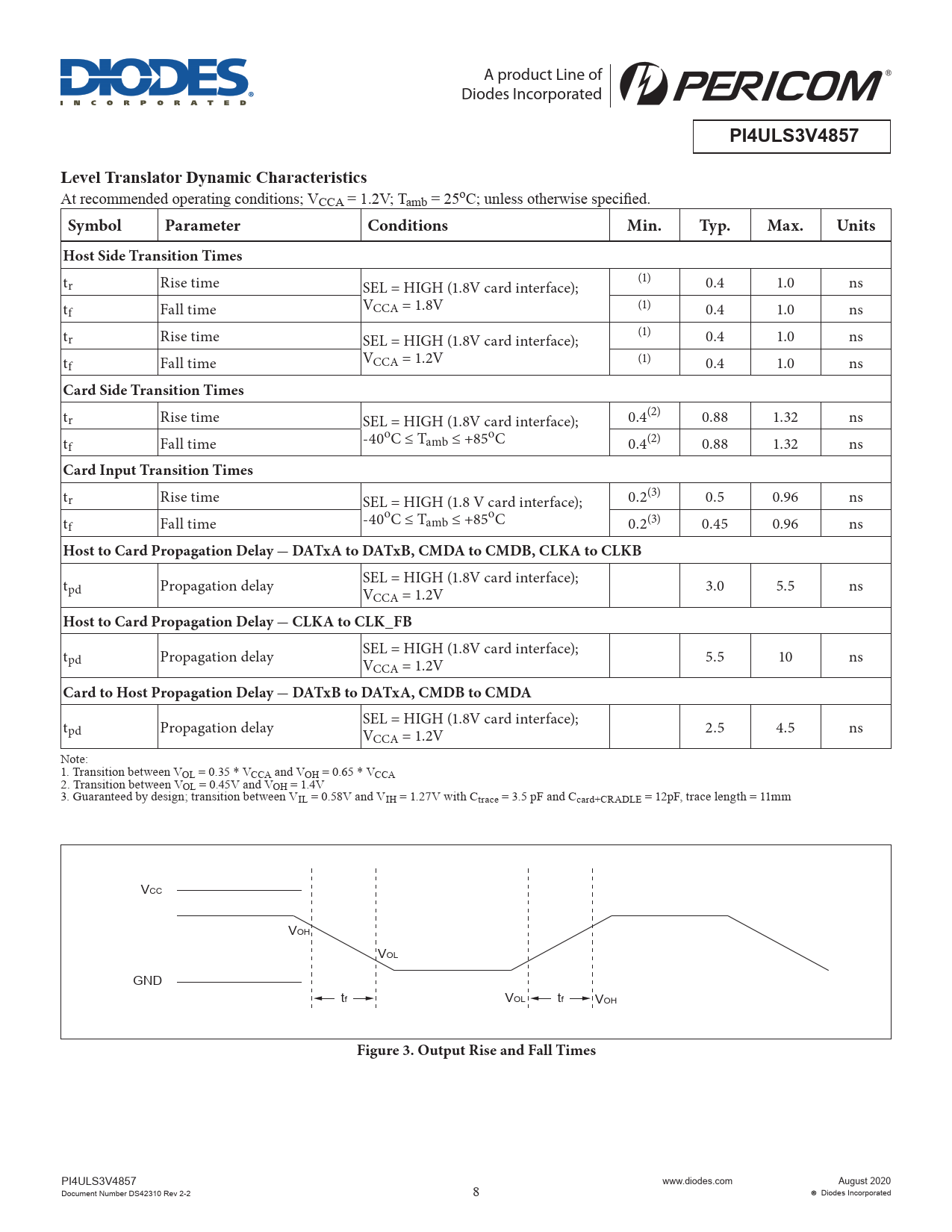 PI4ULS3V4857. Level Translator Dynamic Characteristics. Symbol. Parameter. Conditions. Min. Typ. Max. Units. Host Side Transition Times