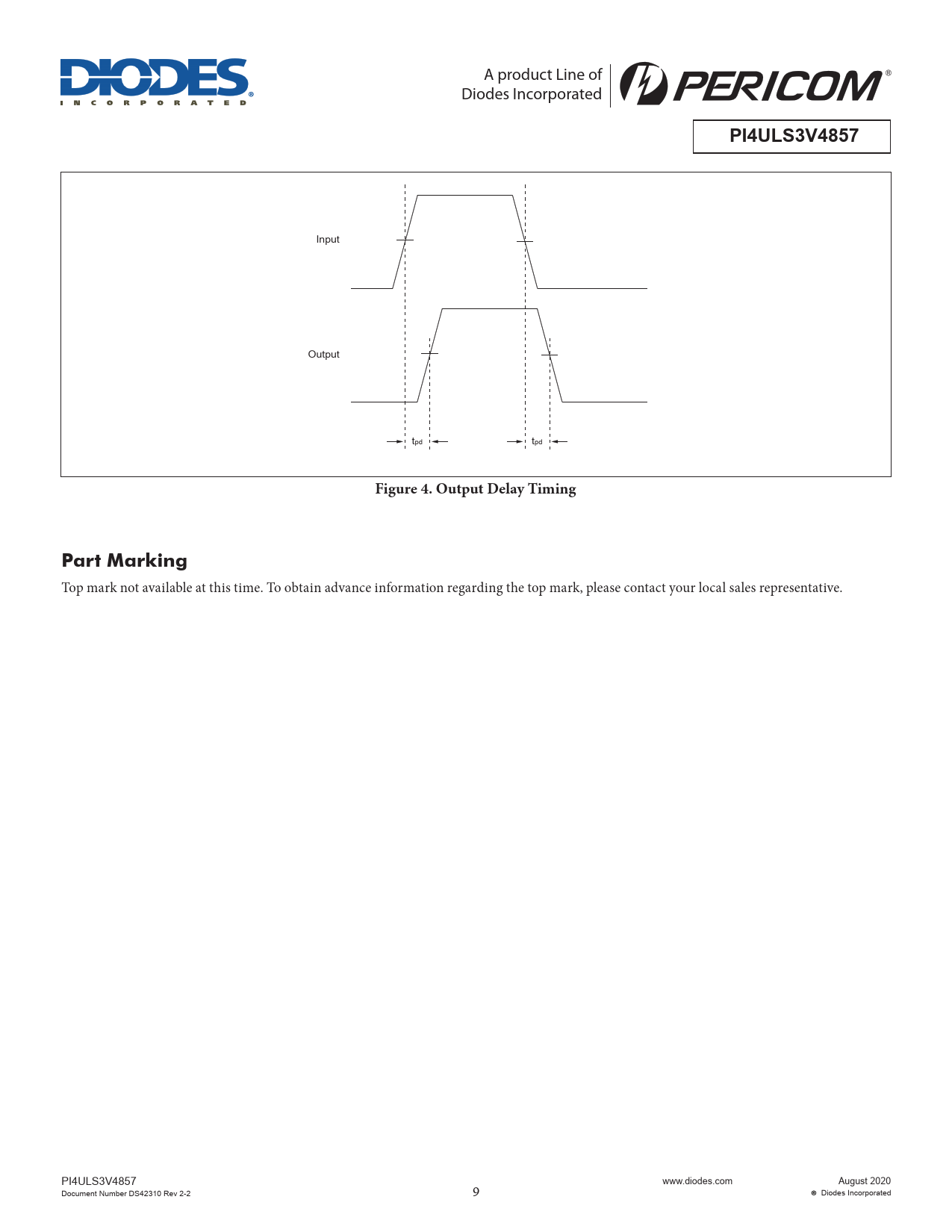 A product Line of Diodes Incorporated PI4ULS3V4857 Input Output tpd tpd Figure 4. Output Delay TimingPart Marking Top mark not available at this time. To obtain advance information regarding the top mark, please contact your local sales representative. PI4ULS3V4857 www.diodes.com August 2020 Document Number DS42310 Rev 2-2 9 Diodes Incorporated