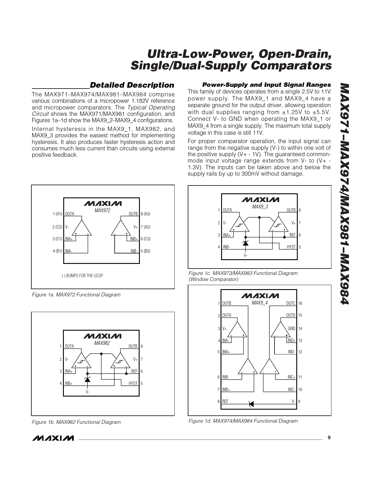 Ultra-Low-Power, Open-Drain,Single/Dual-Supply ComparatorsMAX971–MAX974/MAX981–MAX984Detailed DescriptionPower-Supply and Input Signal Ranges This family of devices operates from a single 2.5V to 11V The MAX971–MAX974/MAX981–MAX984 comprise various combinations of a micropower 1.182V reference power supply. The MAX9_1 and MAX9_4 have a and micropower comparators. The Typical Operating separate ground for the output driver, allowing operation Circuit shows the MAX971/MAX981 configuration, and with dual supplies ranging from ±1.25V to ±5.5V. Figures 1a–1d show the MAX9_2–MAX9_4 configurations. Connect V- to GND when operating the MAX9_1 or MAX9_4 from a single supply. The maximum total supply Internal hysteresis in the MAX9_1, MAX982, and voltage in this case is still 11V. MAX9_3 provides the easiest method for implementing hysteresis. It also produces faster hysteresis action and For proper comparator operation, the input signal can consumes much less current than circuits using external range from the negative supply (V-) to within one volt of positive feedback. the positive supply (V+ - 1V). The guaranteed common- mode input voltage range extends from V- to (V+ - 1.3V). The inputs can be taken above and below the supply rails by up to 300mV without damage. MAX9_3 MAX972 1 OUTA OUTB 8 1 (A1) OUTA OUTB 8 (A3) 2 V- V+ 7 2 (C2) V- V+ 7 (A2) 3 INA+ REF 6 3 (C1) INA+ INB+ 6 (C3) 4 INB- HYST 5 4 (B1) INA- INB- 5 (B3) V- Figure 1c. MAX973/MAX983 Functional Diagram ( ) BUMPS FOR THE UCSP (Window Comparator) Figure 1a. MAX972 Functional Diagram 1 OUTB MAX9_4 OUTC 16 2 OUTA OUTD 15 3 V+ GND 14 4 INA- IND+ 13 MAX982 1 OUTA OUTB 8 5 INA+ IND- 12 2 V- V+ 7 3 INA+ REF 6 6 INB- INC+ 11 4 INB+ HYST 5 7 INB+ INC- 10 V- 8 REF V- 9 Figure 1b. MAX982 Functional Diagram Figure 1d. MAX974/MAX984 Functional Diagram _______________________________________________________________________________________9