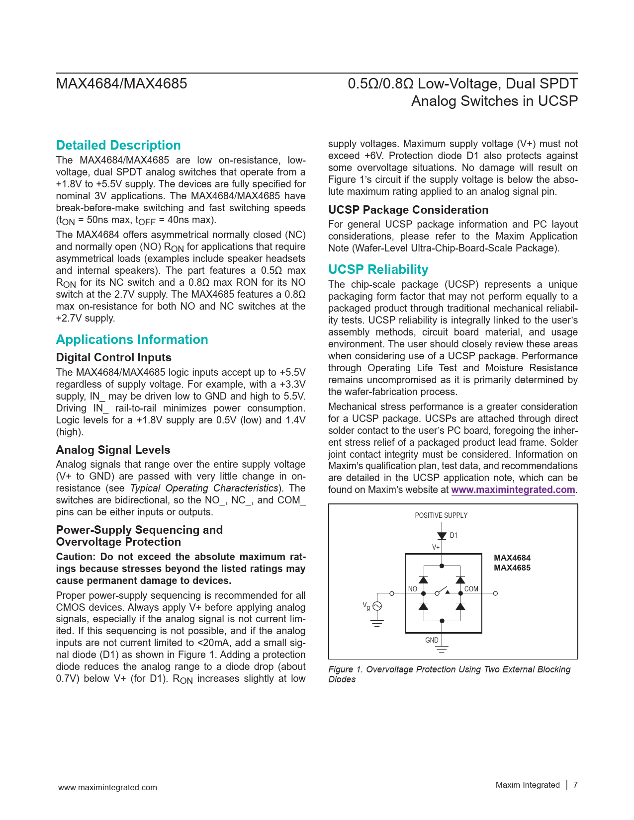 ent stress relief of a packaged product lead frame. Solder joint contact integrity must be considered. Information on Analog signals that range over the entire supply voltage Maxim’s qualification plan, test data, and recommendations (V+ to GND) are passed with very little change in on- are detailed in the UCSP application note, which can be resistance (see Typical Operating Characteristics). The found on Maxim’s website at
