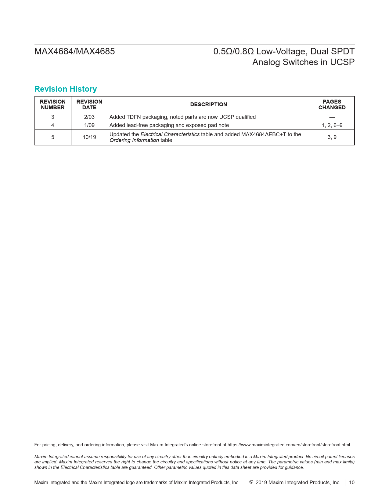 3 2/03 Added TDFN packaging, noted parts are now UCSP qualified — 4 1/09 Added lead-free packaging and exposed pad note 1, 2, 6–9 5 10/19 Updated the Electrical Characteristics table and added MAX4684AEBC+T to the Ordering Information table 3, 9 For pricing, delivery, and ordering information, please visit Maxim Integrated’s online storefront at https://www.maximintegrated.com/en/storefront/storefront.html. Maxim Integrated cannot assume responsibility for use of any circuitry other than circuitry entirely embodied in a Maxim Integrated product. No circuit patent licenses are implied. Maxim Integrated reserves the right to change the circuitry and specifications without notice at any time. The parametric values (min and max limits) shown in the Electrical Characteristics table are guaranteed. Other parametric values quoted in this data sheet are provided for guidance. Maxim Integrated and the Maxim Integrated logo are trademarks of Maxim Integrated Products, Inc. © 2019 Maxim Integrated Products, Inc. │ 10