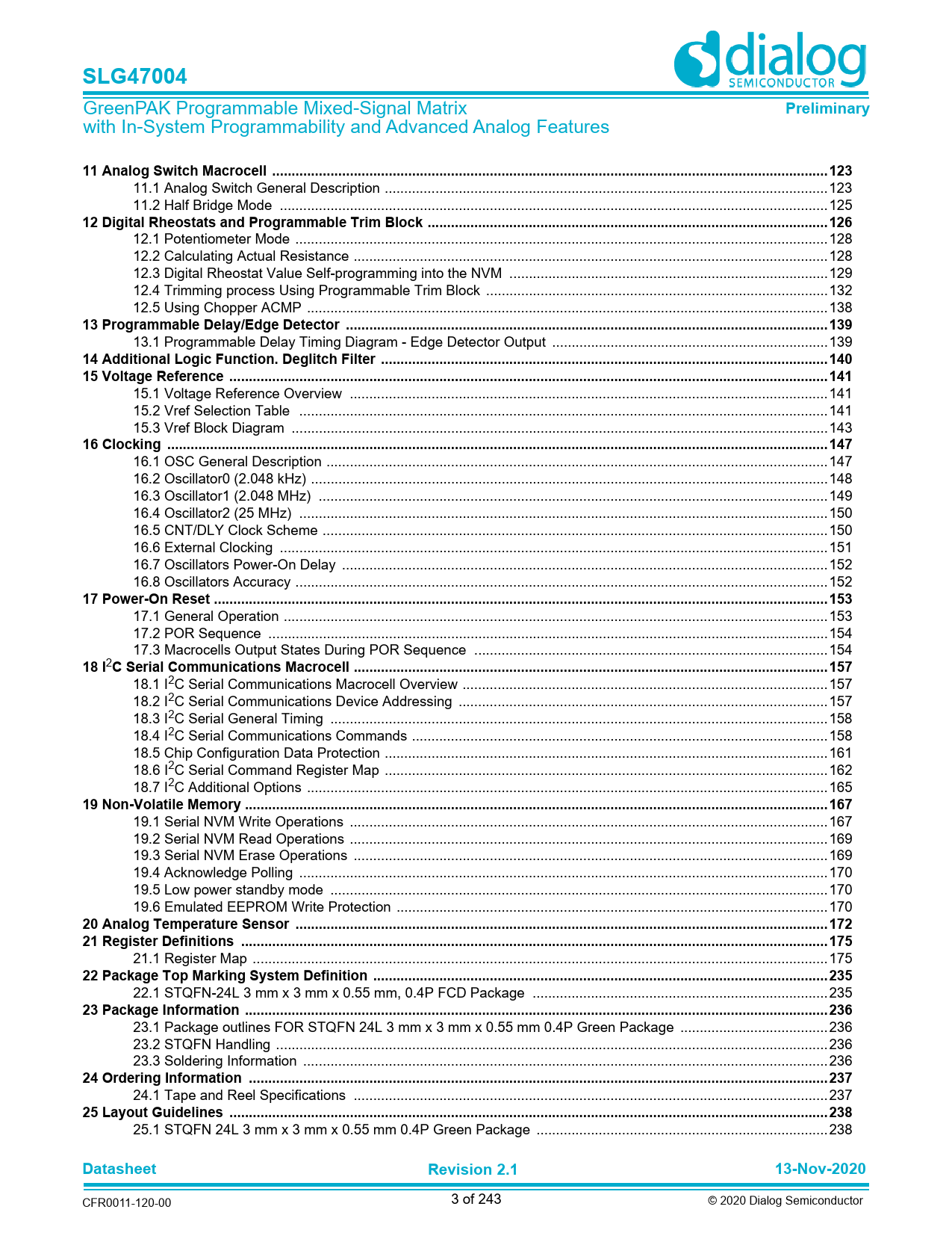 | Pages / Page | 243 / 3 — SLG47004. Preliminary. 11 Analog Switch Macrocell ... 123. 12 Digital … |