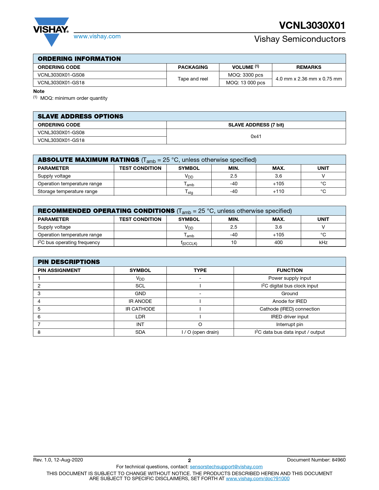 VCNL3030X01 www.vishay.com Vishay Semiconductors ORDERING INFORMATION ORDERING CODEPACKAGINGVOLUME (1)REMARKS VCNL3030X01-GS08 MOQ: 3300 pcs Tape and reel 4.0 mm x 2.36 mm x 0.75 mm VCNL3030X01-GS18 MOQ: 13 000 pcs Note (1) MOQ: minimum order quantity SLAVE ADDRESS OPTIONS ORDERING CODESLAVE ADDRESS (7 bit) VCNL3030X01-GS08 0x41 VCNL3030X01-GS18 ABSOLUTE MAXIMUM RATINGS (Tamb = 25 °C, unless otherwise specified) PARAMETERTEST CONDITIONSYMBOLMIN.MAX.UNIT Supply voltage VDD 2.5 3.6 V Operation temperature range Tamb -40 +105 °C Storage temperature range Tstg -40 +110 °C RECOMMENDED OPERATING CONDITIONS (Tamb = 25 °C, unless otherwise specified) PARAMETERTEST CONDITIONSYMBOLMIN.MAX.UNIT Supply voltage VDD 2.5 3.6 V Operation temperature range Tamb -40 +105 °C I2C bus operating frequency f(I2CCLK) 10 400 kHz PIN DESCRIPTIONS PIN ASSIGNMENTSYMBOLTYPEFUNCTION 1 VDD - Power supply input 2 SCL I I2C digital bus clock input 3 GND - Ground 4 IR ANODE I Anode for IRED 5 IR CATHODE I Cathode (IRED) connection 6 LDR I IRED driver input 7 INT O Interrupt pin 8 SDA I / O (open drain) I2C data bus data input / output Rev. 1.0, 12-Aug-2020 2 Document Number: 84960 For technical questions, contact: sensorstechsupport@vishay.com THIS DOCUMENT IS SUBJECT TO CHANGE WITHOUT NOTICE. THE PRODUCTS DESCRIBED HEREIN AND THIS DOCUMENT ARE SUBJECT TO SPECIFIC DISCLAIMERS, SET FORTH AT www.vishay.com/doc?91000
