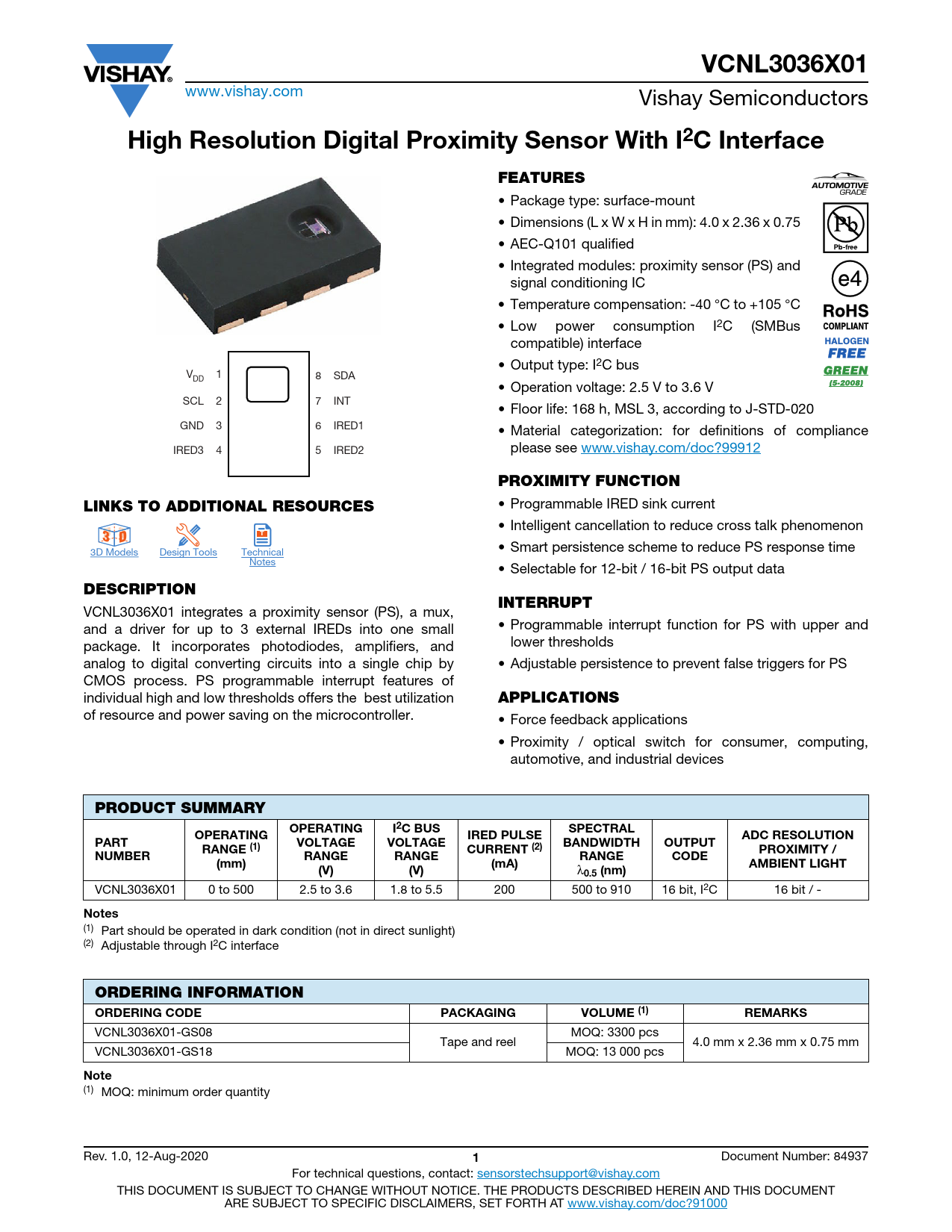VCNL3036X01 www.vishay.com Vishay Semiconductors High Resolution Digital Proximity Sensor With I2C InterfaceFEATURES • Package type: surface-mount • Dimensions (L x W x H in mm): 4.0 x 2.36 x 0.75 • AEC-Q101 qualified • Integrated modules: proximity sensor (PS) and signal conditioning IC • Temperature compensation: -40 °C to +105 °C • Low power consumption I2C (SMBus compatible) interface • Output type: I2C bus V 1 DD 8 SDA • Operation voltage: 2.5 V to 3.6 V SCL 2 7 INT • Floor life: 168 h, MSL 3, according to J-STD-020 GND 3 6 IRED1 • Material categorization: for definitions of compliance IRED3 4 5 IRED2 please see www.vishay.com/doc?99912 PROXIMITY FUNCTIONLINKS TO ADDITIONAL RESOURCES • Programmable IRED sink current • Intelligent cancellation to reduce cross talk phenomenon D 33 DT • Smart persistence scheme to reduce PS response time 3D Models Design Tools Technical Notes • Selectable for 12-bit / 16-bit PS output data DESCRIPTIONINTERRUPT VCNL3036X01 integrates a proximity sensor (PS), a mux, and a driver for up to 3 external IREDs into one small • Programmable interrupt function for PS with upper and package. It incorporates photodiodes, amplifiers, and lower thresholds analog to digital converting circuits into a single chip by • Adjustable persistence to prevent false triggers for PS CMOS process. PS programmable interrupt features of individual high and low thresholds offers the best utilization APPLICATIONS of resource and power saving on the microcontroller. • Force feedback applications • Proximity / optical switch for consumer, computing, automotive, and industrial devices PRODUCT SUMMARYOPERATINGI2C BUSSPECTRALOPERATINGIRED PULSEADC RESOLUTIONPARTVOLTAGEVOLTAGEBANDWIDTHOUTPUTRANGE (1)CURRENT (2)PROXIMITY /NUMBERRANGERANGERANGECODE(mm)(mA)AMBIENT LIGHT(V)(V) λ 0.5 (nm) VCNL3036X01 0 to 500 2.5 to 3.6 1.8 to 5.5 200 500 to 910 16 bit, I2C 16 bit / - Notes (1) Part should be operated in dark condition (not in direct sunlight) (2) Adjustable through I2C interface ORDERING INFORMATION ORDERING CODEPACKAGINGVOLUME (1)REMARKS VCNL3036X01-GS08 MOQ: 3300 pcs Tape and reel 4.0 mm x 2.36 mm x 0.75 mm VCNL3036X01-GS18 MOQ: 13 000 pcs Note (1) MOQ: minimum order quantity Rev. 1.0, 12-Aug-2020 1 Document Number: 84937 For technical questions, contact: sensorstechsupport@vishay.com THIS DOCUMENT IS SUBJECT TO CHANGE WITHOUT NOTICE. THE PRODUCTS DESCRIBED HEREIN AND THIS DOCUMENT ARE SUBJECT TO SPECIFIC DISCLAIMERS, SET FORTH AT www.vishay.com/doc?91000