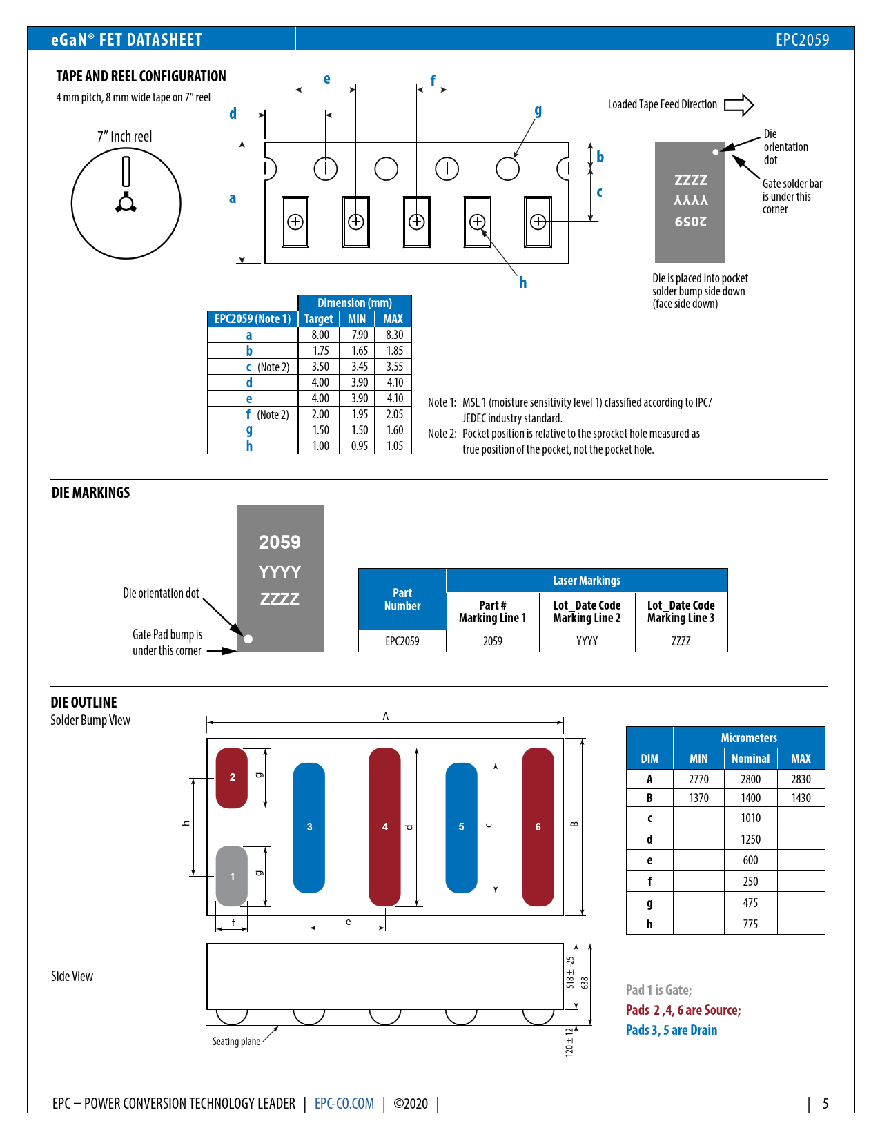 eGaN® FET DATASHEET. TAPE AND REEL CONFIGURATION. Z Z. YYY. 2059. DIM. Dimension (mm). EPC2059 (Note 1) Target MIN. MAX. DIE MARKINGS