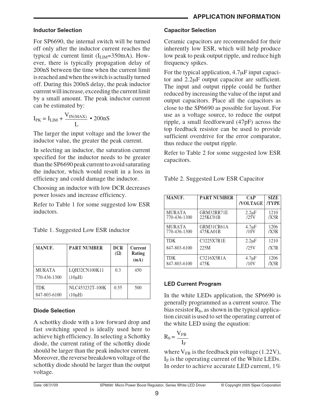 For SP6690, the internal switch will be turned Ceramic capacitors are recommended for their off only after the inductor current reaches the inherently low ESR, which will help produce typical dc current limit (ILIM=350mA). How- low peak to peak output ripple, and reduce high ever, there is typically propagation delay of frequency spikes. 200nS between the time when the current limit For the typical application, 4.7µF input capaci- is reached and when the switch is actually turned tor and 2.2µF output capacitor are sufficient. off. During this 200nS delay, the peak inductor The input and output ripple could be further current will increase, exceeding the current limit reduced by increasing the value of the input and by a small amount. The peak inductor current output capacitors. Place all the capacitors as can be estimated by: close to the SP6690 as possible for layout. For V use as a voltage source, to reduce the output I IN(MAX) PK = ILIM + • 200nS L ripple, a small feedforward (47pF) across the top feedback resistor can be used to provide The larger the input voltage and the lower the sufficient overdrive for the error comparator, inductor value, the greater the peak current. thus reduce the output ripple. In selecting an inductor, the saturation current Refer to Table 2 for some suggested low ESR specified for the inductor needs to be greater capacitors. than the SP6690 peak current to avoid saturating the inductor, which would result in a loss in efficiency and could damage the inductor. Table 2. Suggested Low ESR Capacitor Choosing an inductor with low DCR decreases power losses and increase efficiency.