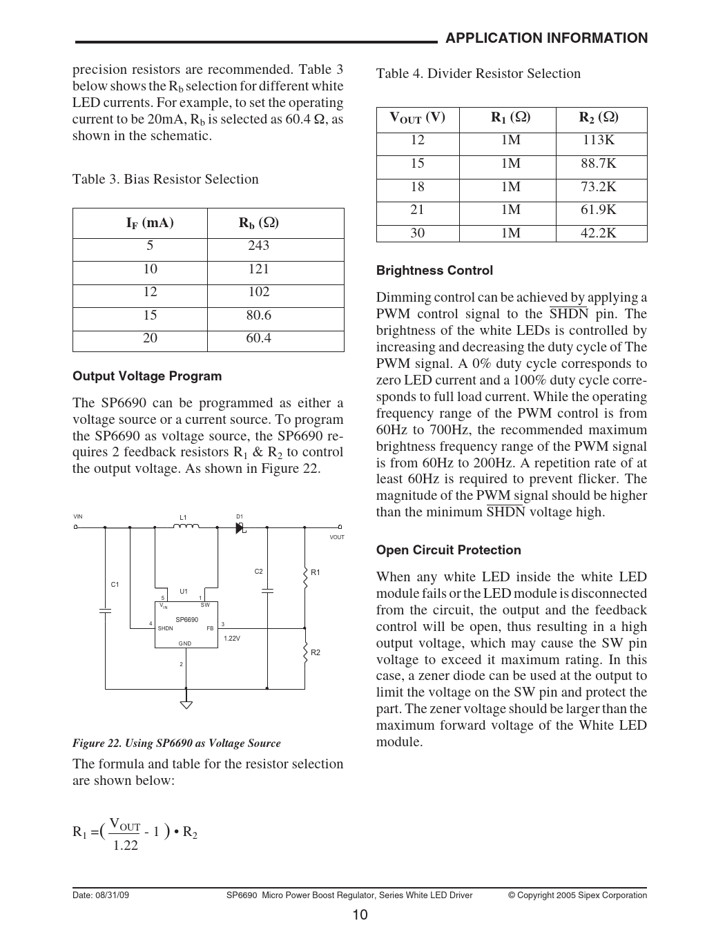 module. The formula and table for the resistor selection are shown below: R1 =( VOUT - 1 ) • R2 1.22 Date: 08/31/09 SP6690 Micro Power Boost Regulator, Series White LED Driver © Copyright 2005 Sipex Corporation 10
