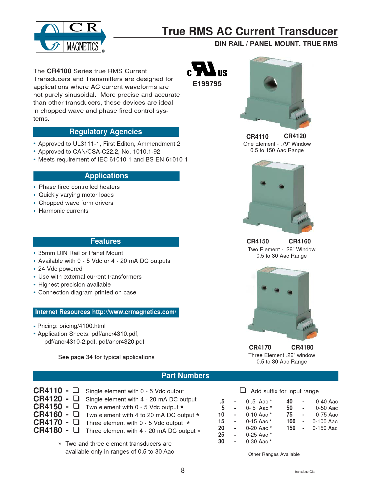 True RMS AC Current TransducerDIN RAIL / PANEL MOUNT, TRUE RMS The CR4100 Series true RMS Current Transducers and Transmitters are designed for E199795 applications where AC current waveforms are not purely sinusoidal. More precise and accurate than other transducers, these devices are ideal in chopped wave and phase fired control sys- tems. Regulatory AgenciesCR4110CR4120 • Approved to UL3111-1, First Editon, Ammendment 2 One Element - .79” Window 0.5 to 150 Aac Range • Approved to CAN/CSA-C22.2, No. 1010.1-92 • Meets requirement of IEC 61010-1 and BS EN 61010-1 Applications • Phase fired controlled heaters • Quickly varying motor loads • Chopped wave form drivers • Harmonic currents FeaturesCR4150CR4160 Two Element - .26” Window • 35mm DIN Rail or Panel Mount 0.5 to 30 Aac Range • Available with 0 - 5 Vdc or 4 - 20 mA DC outputs • 24 Vdc powered • Use with external current transformers • Highest precision available • Connection diagram printed on case Internet Resources http://www.crmagnetics.com/ • Pricing: pricing/4100.html • Application Sheets: pdf/ancr4310.pdf, pdf/ancr4310-2.pdf, pdf/ancr4320.pdf CR4170CR4180 Three Element .26” window See page 34 for typical applications 0.5 to 30 Aac Range Part NumbersCR4110 - ❑ Single element with 0 - 5 Vdc output ❑ Add suffix for input range CR4120 - ❑ Single element with 4 - 20 mA DC output .5- 0-.5 Aac * 40- 0-40 Aac CR4150 - ❑ Two element with 0 - 5 Vdc output * 5- 0- 5 Aac * 50- 0-50 Aac CR4160 - ❑ Two element with 4 to 20 mA DC output * 10- 0-10 Aac * 75- 0-75 Aac CR4170 - ❑ Three element with 0 - 5 Vdc output * 15- 0-15 Aac * 100- 0-100 Aac CR4180 - ❑ Three element with 4 - 20 mA DC output * 20- 0-20 Aac * 150- 0-150 Aac 25- 0-25 Aac * 30- 0-30 Aac * * Two and three element transducers are available only in ranges of 0.5 to 30 Aac Other Ranges Available 8 transducer03a