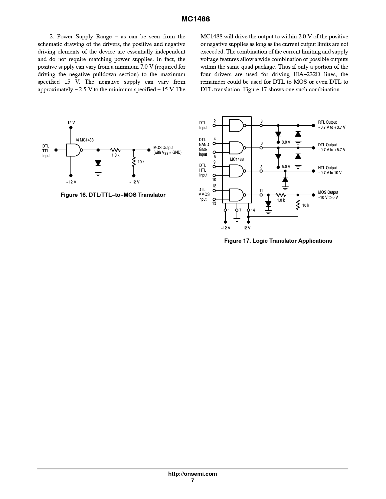 MC1488. Figure 16. DTL/TTL−to−MOS Translator. Figure 17. Logic Translator Applications. http://onsemi.com