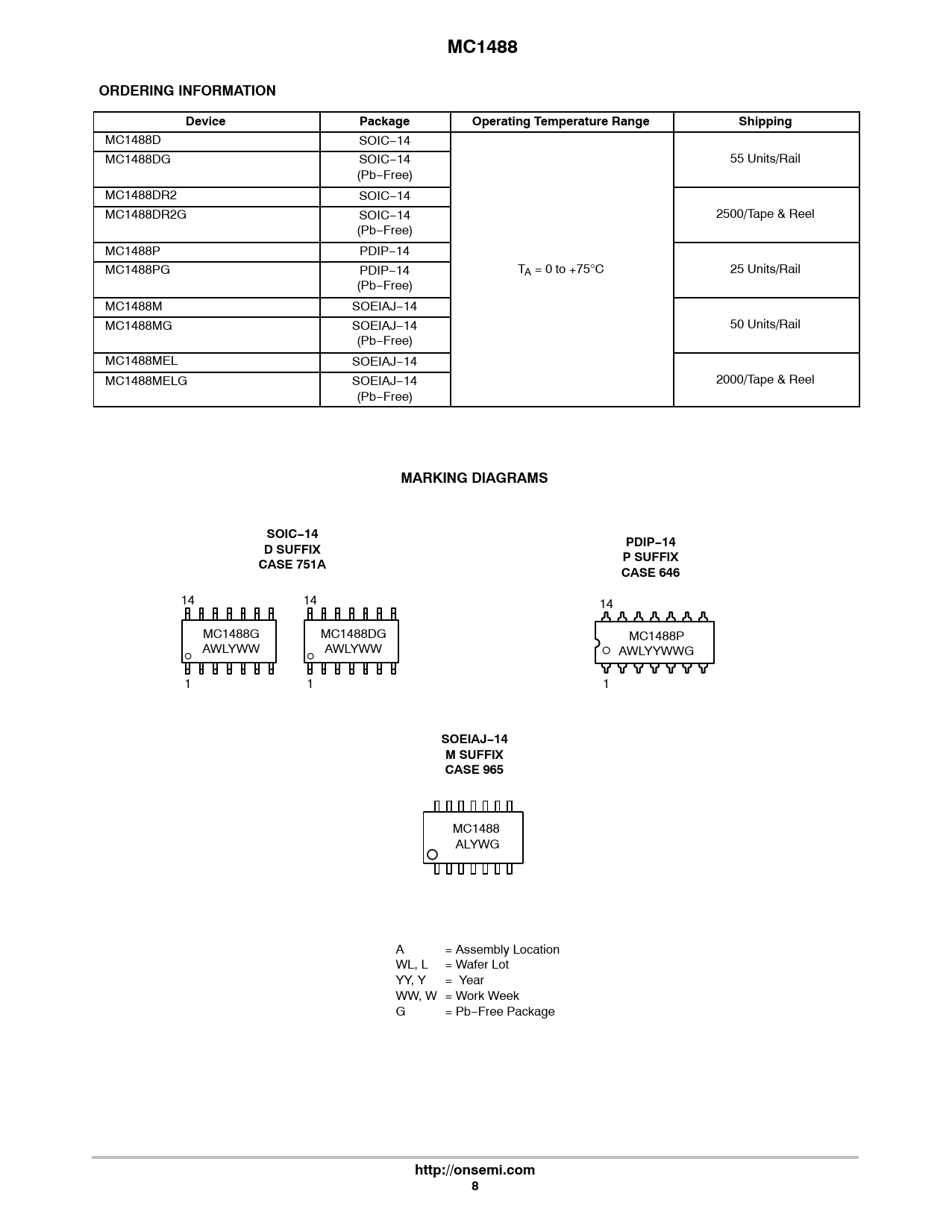 MC1488 ALYWG A = Assembly Location WL, L = Wafer Lot YY, Y = Year WW, W = Work Week G = Pb−Free Package