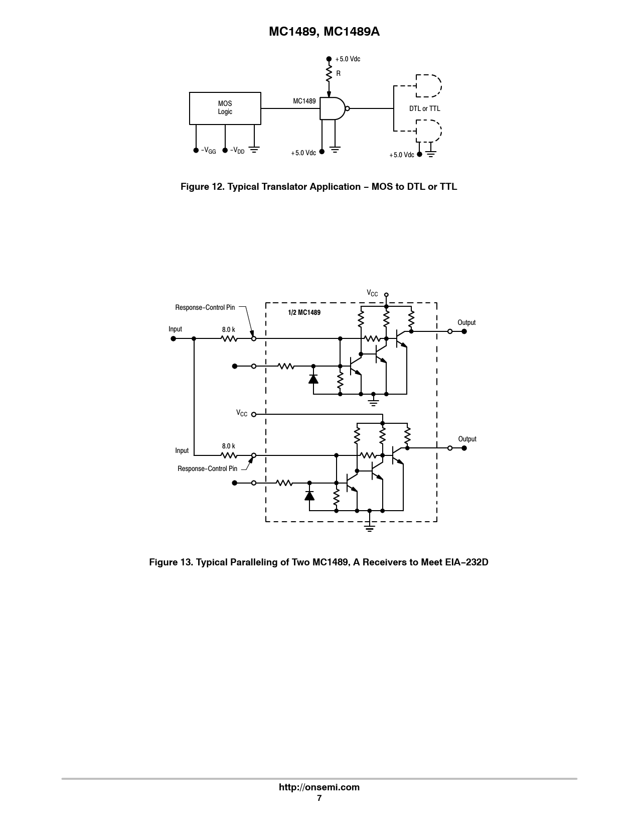 MC1489, MC1489A +5.0 Vdc R MC1489 MOS DTL or TTL Logic -V -V GG DD +5.0 Vdc +5.0 Vdc Figure 12. Typical Translator Application − MOS to DTL or TTL VCC Response-Control Pin 1/2 MC1489 Output Input 8.0 k VCC Output 8.0 k Input Response-Control Pin Figure 13. Typical Paralleling of Two MC1489, A Receivers to Meet EIA−232Dhttp://onsemi.com7
