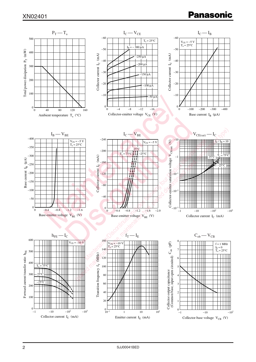 XN02401 PT Ta IC VCE IC IB 500 −60 −60 Ta = 25°C VCE = −5 V T I a = 25°C ) − B = − 300 µA 50 −50 400 ) (mW −250 µA T (mA (mA −40 −40 P C −200 µA C 300 −30 −30 −150 µA 200 −20 − − 20 100 µA Collector current I Collector current I 100 Total power dissipation −10 − −10 50 µA 0 0 0 0 40 80 120 160 0 −4 −8 −12 −16 0 −100 −200 −300 −400 Ambient temperature T (°C) Collector-emitter voltage V (V) Base current I (µA) a CE B IB VBE IC VBE VCE(sat) IC −400 −240 ) −10 VCE = −5 V V IC / IB = 10 CE = −5 V T (V − a = 25°C 350 − 25°C 200 CE(sat) − T 300 ) a = 75°C −25°C T ) −1 a = 75°C 25°C (mA (µA −160 −250 C −25°C B −200 −120 −10−1 −150 −80 Base current I −100 Collector current I −10−2 −40 −50 0 Collector-emitter saturation voltage V 0 −10−3 0 −0.4 −0.8 −1.2 −1.6 0 −0.4 −0.8 −1.2 −1.6 −2.0 −1 −10 −102 −103 Base-emitter voltage V (V) BE Base-emitter voltage V (V) BE Collector current I (mA) C Maintenance/ hFE IC fT IE Cob VCB Discontinued 600 160 8 VCE = –10 V VCB = −10 V f = 1 MHz Ta = 25°C I 140 (pF) E = 0 7 500 ob Ta = 25°C FE ) C 120 6 Maintenance/Discontinued includes following four Product lifecycle stage. (MHz 400 T Ta = 75°C 100 5 300 25°C 80 4 (planed maintenance type, maintenance type, planed discontinued typed, discontinued type) −25°C 60 3 200 40 2 Forward current transfer ratio h 100 Transition frequency f 20 1 0 0 Collector output capacitance (Common base, input open circuited) − 0 1 −10 −102 −103 10−1 1 10 102 −1 −10 −102 Collector current I (mA) C Emitter current I (mA) E Collector-base voltage V (V) CB 2 SJJ00041BED
