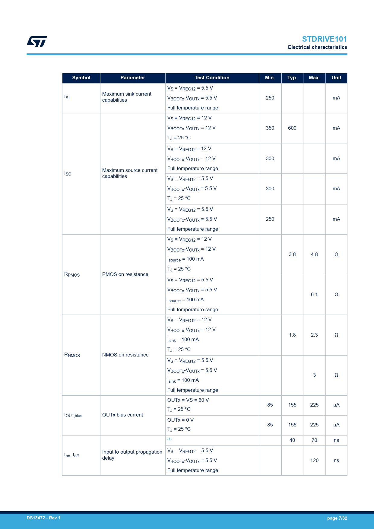 STDRIVE101. Electrical characteristics. Symbol. Parameter. Test Condition. Min. Typ. Max. Unit. DS13472. Rev 1. page 7/32