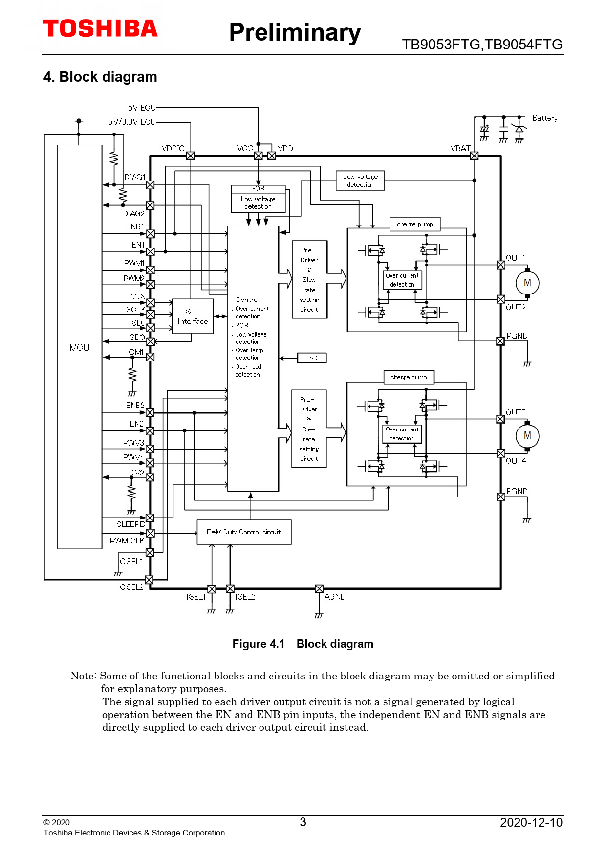 Note: Some of the functional blocks and circuits in the block diagram may be omitted or simplified for explanatory purposes. The signal supplied to each driver output circuit is not a signal generated by logical operation between the EN and ENB pin inputs, the independent EN and ENB signals are directly supplied to each driver output circuit instead. © 20 20 3 2020-12-10 Toshiba Electronic Devices & Storage Corporation