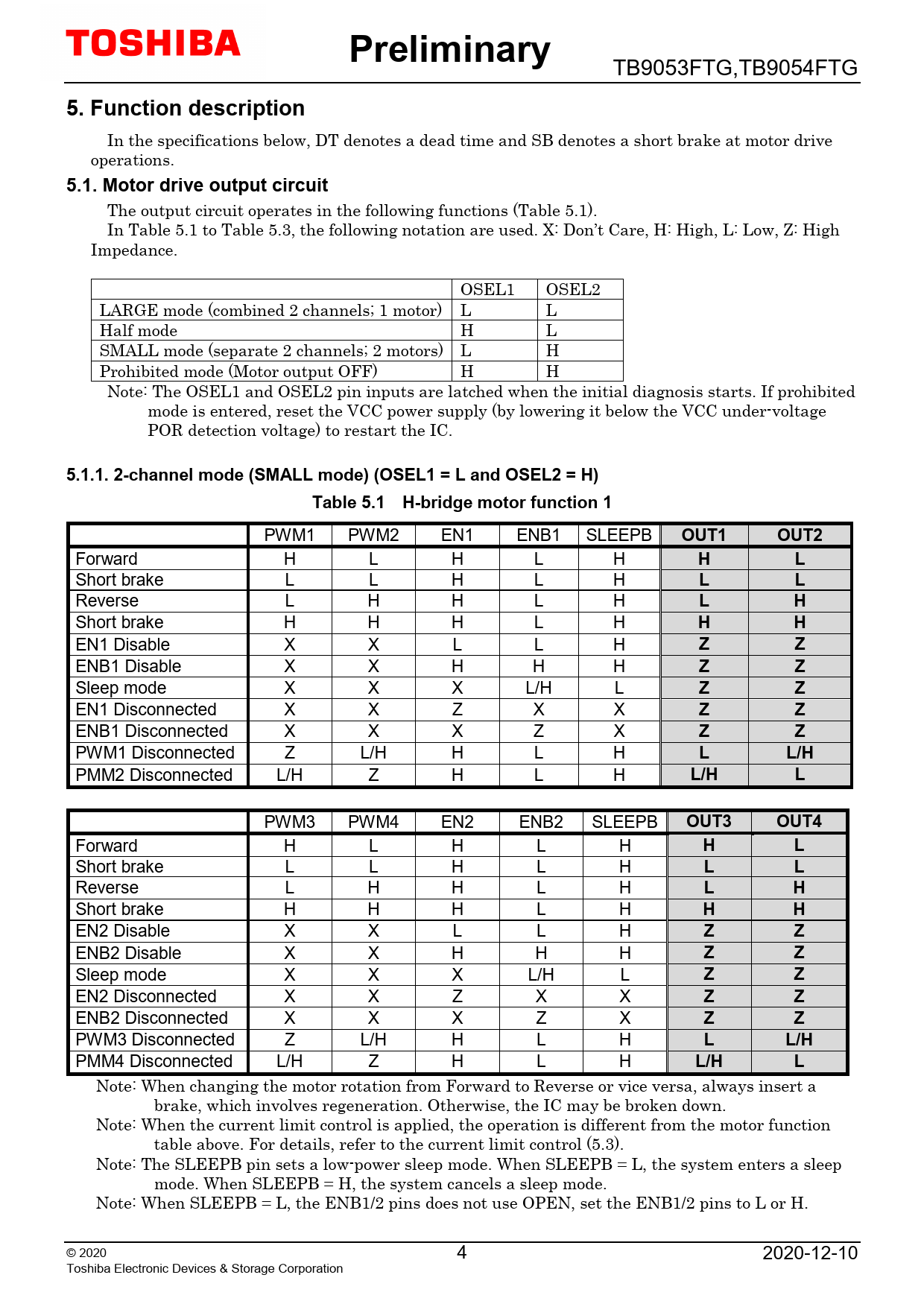 Note: When changing the motor rotation from Forward to Reverse or vice versa, always insert a brake, which involves regeneration. Otherwise, the IC may be broken down. Note: When the current limit control is applied, the operation is different from the motor function table above. For details, refer to the current limit control (5.3). Note: The SLEEPB pin sets a low-power sleep mode. When SLEEPB = L, the system enters a sleep mode. When SLEEPB = H, the system cancels a sleep mode. Note: When SLEEPB = L, the ENB1/2 pins does not use OPEN, set the ENB1/2 pins to L or H. © 20 20 4 2020-12-10 Toshiba Electronic Devices & Storage Corporation