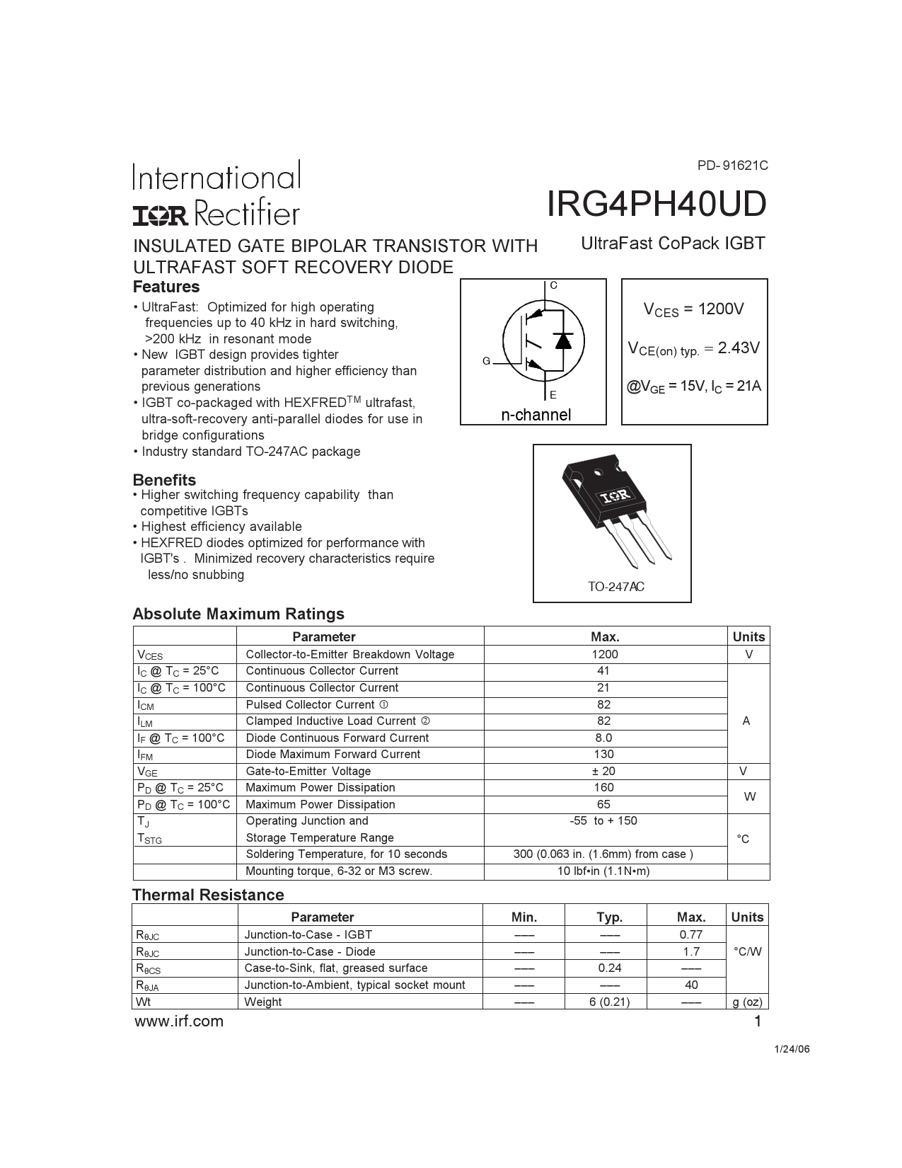 PD- 91621C IRG4PH40UD INSULATED GATE BIPOLAR TRANSISTOR WITH UltraFast CoPack IGBT ULTRAFAST SOFT RECOVERY DIODE