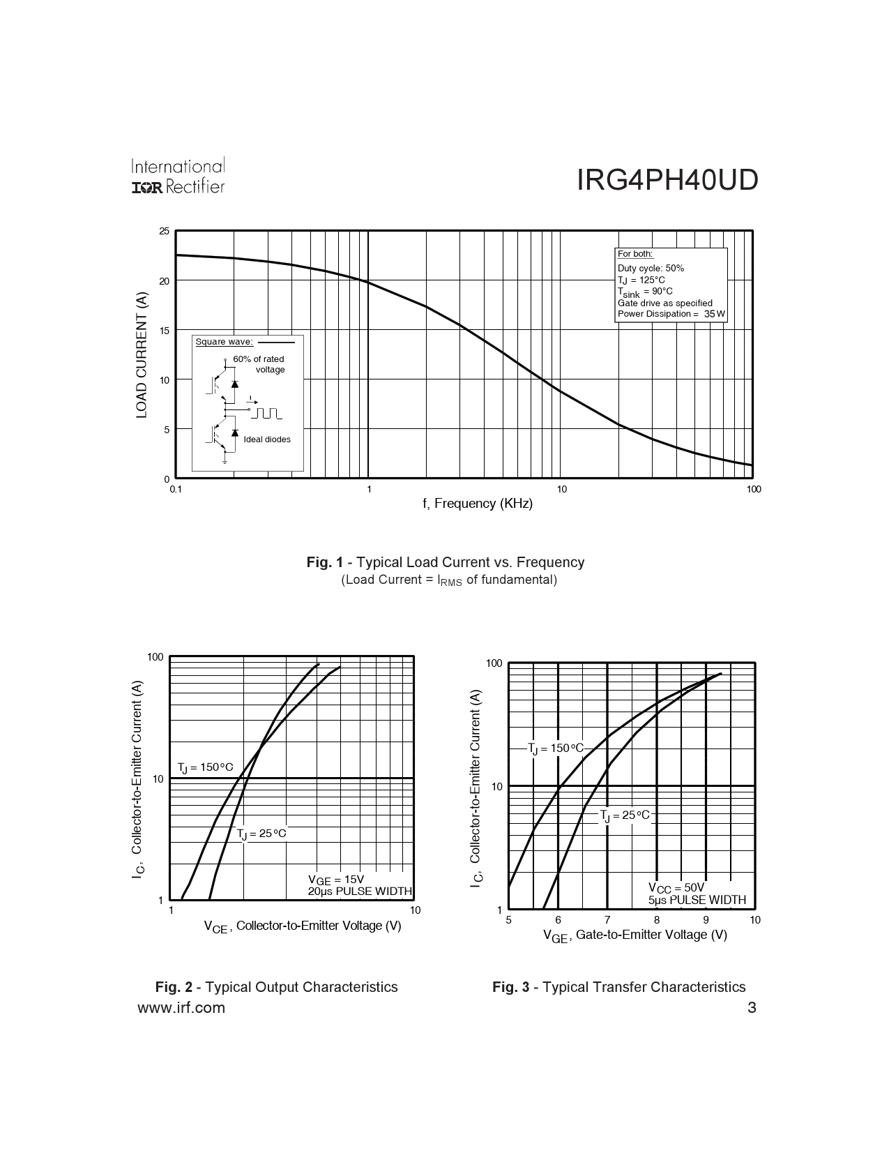 IRG4PH40UD 25 For both: Duty cycle: 50% 20 T J = 125°C ) T = 90°C sink (A Gate drive as specified Power Dissipation = W 35 NT 15 Square wave: 60% of rated voltage CURRE 10 D A I LO 5 Ideal diodes 00.1 1 10 100 f, Frequency (KHz)