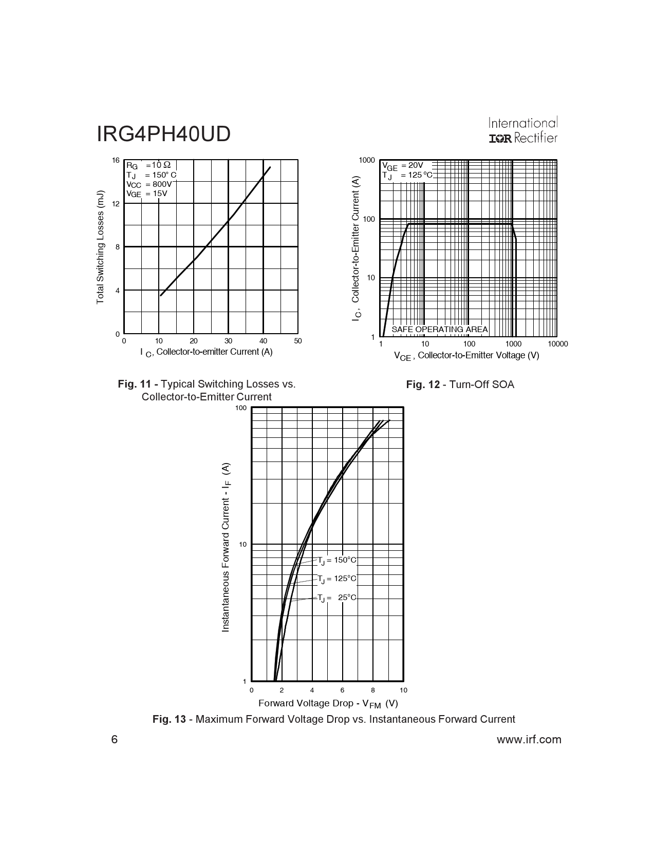 IRG4PH40UD 16 1000 R = G Ohm 10 Ω V = 20V GE T = 150 C J ° T = 125 C o J V = 800V CC J) V = GE 15V 12 100 itter Current (A) 8 ng Losses (m itchi w 10 4 otal S T I , Collector-to-Em C SAFE OPERATING AREA 0 1 0 10 20 30 40 50 1 10 100 1000 10000 I , Collector-to-emitter Current (A) C V , Col ector-to-Emitter Voltage (V) CE Fig. 11 - Typical Switching Losses vs. Fig. 12 - Turn-Off SOA Collector-to-Emitter Current 100 ) A ( F I - rrent u d C ar 10 rw o T = 150°C F J us T = 125°C J taneo T = 25°C J n a st In 1 0 2 4 6 8 10 Forward Voltage Drop - FM V (V) Fig. 13 - Maximum Forward Voltage Drop vs. Instantaneous Forward Current 6 www.irf.com