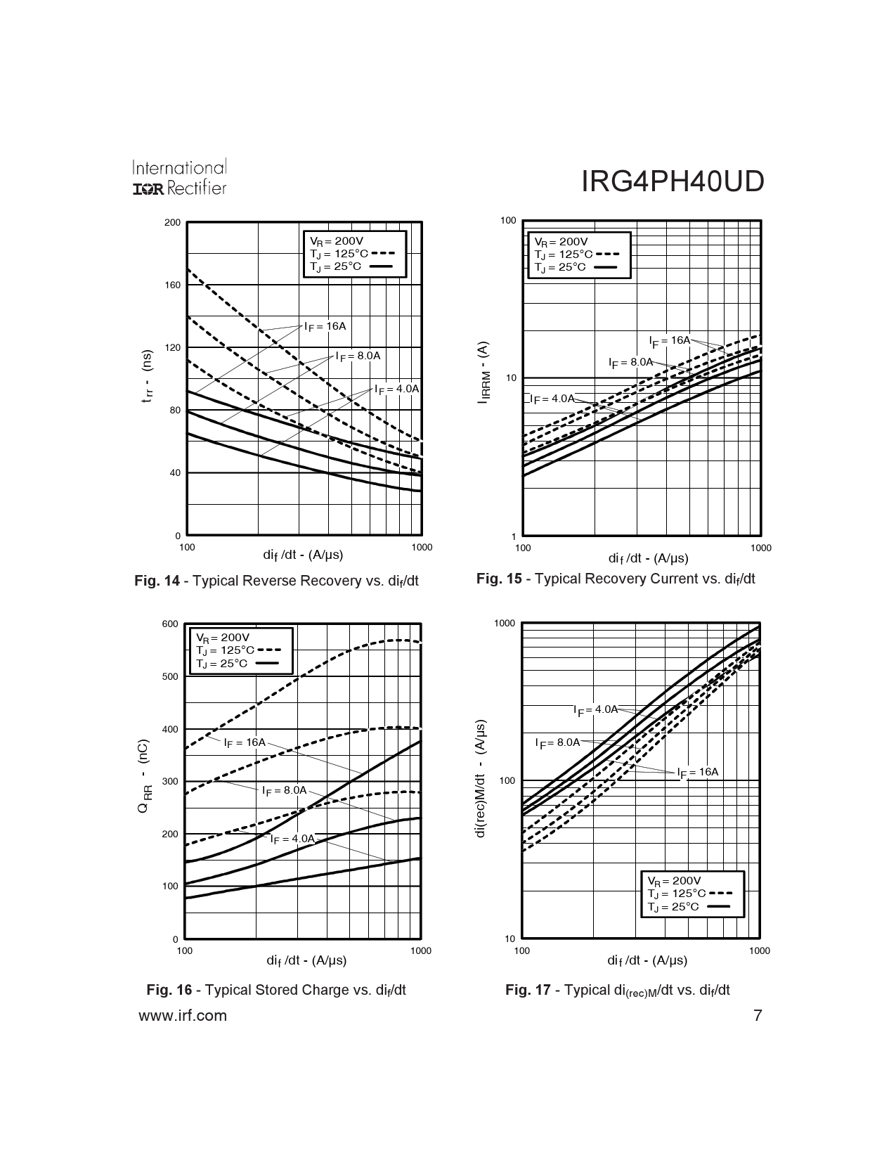 IRG4PH40UD 200 100 V R = 200V V R = 200V T = 12 J 5°C T = 12 J 5°C T = 25 J °C T = 25 J °C 160 I = F 16A ) I = 16A 120 F s) I = 8.0A F (A (n - I = 8.0A F - 10 I = 4.0A RM t rr F I IR I F = 4.0A 80 40 0 1 100 1000 di 100 1000 f /dt - (A/µs) dif /dt - (A/µs)