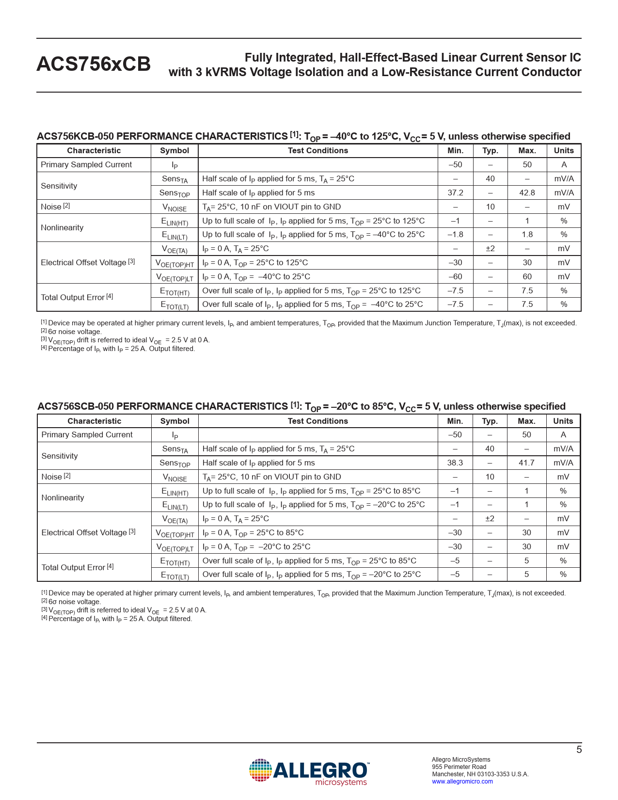 Fully Integrated, Hall-Effect-Based Linear Current Sensor IC ACS756xCB with 3 kVRMS Voltage Isolation and a Low-Resistance Current Conductor ACS756KCB-050 PERFORMANCE CHARACTERISTICS [1]: TOP = –40°C to 125°C, VCC = 5 V, unless otherwise specified Characteristic Symbol Test Conditions Min. Typ. Max. Units