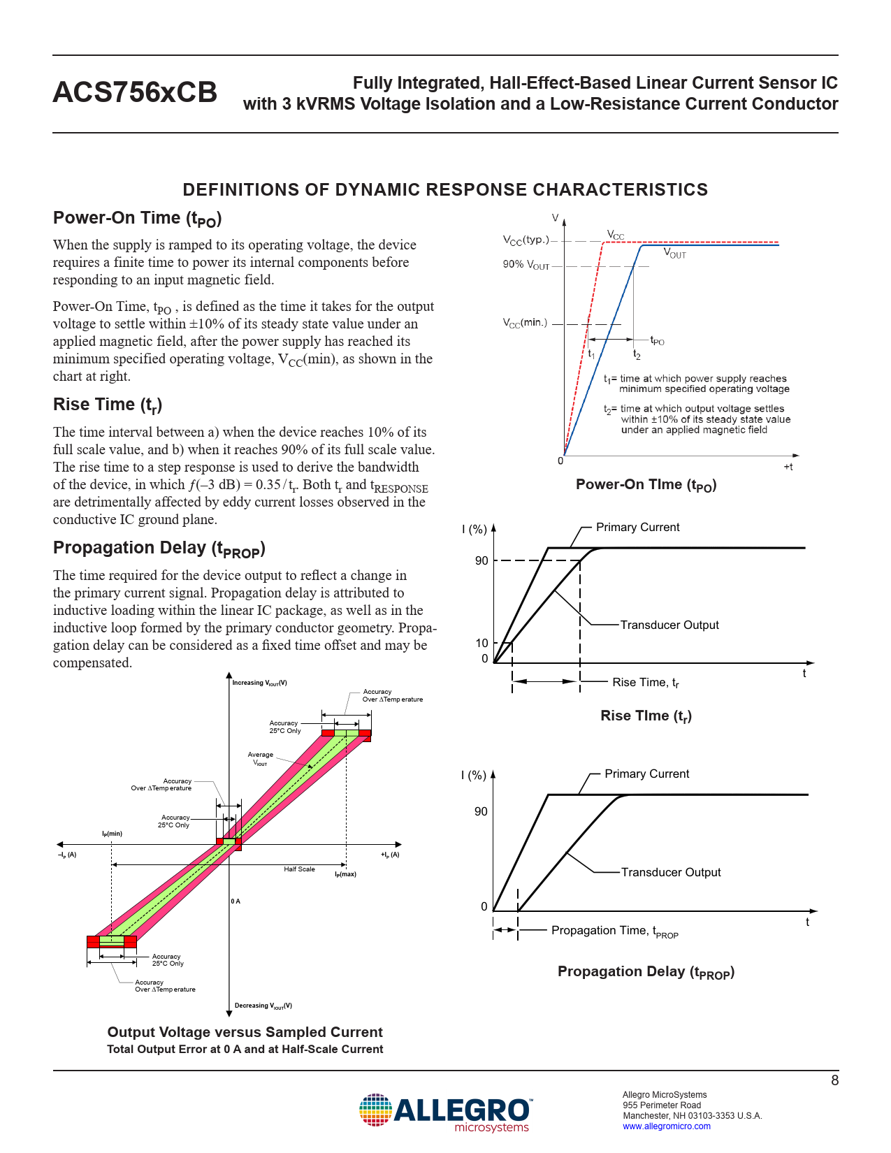 Fully Integrated, Hall-Effect-Based Linear Current Sensor ICACS756xCB with 3 kVRMS Voltage Isolation and a Low-Resistance Current ConductorDEFINITIONS OF DYNAMIC RESPONSE CHARACTERISTICSPower-On Time (tPO) When the supply is ramped to its operating voltage, the device requires a finite time to power its internal components before responding to an input magnetic field. Power-On Time, tPO , is defined as the time it takes for the output voltage to settle within ±10% of its steady state value under an applied magnetic field, after the power supply has reached its minimum specified operating voltage, VCC(min), as shown in the chart at right. Rise Time (tr) The time interval between a) when the device reaches 10% of its full scale value, and b) when it reaches 90% of its full scale value. The rise time to a step response is used to derive the bandwidth of the device, in which ƒ(–3 dB) = 0.35 / tr. Both tr and tRESPONSE Power-On TIme (tPO) are detrimentally affected by eddy current losses observed in the conductive IC ground plane. I (%) Primary Current Propagation Delay (tPROP) 90 The time required for the device output to reflect a change in the primary current signal. Propagation delay is attributed to inductive loading within the linear IC package, as well as in the Transducer Output inductive loop formed by the primary conductor geometry. Propa- gation delay can be considered as a fixed time offset and may be 100 compensated. t Increasing V Rise Time, t IOUT (V) r Accuracy v O r e ∆Temp erature Rise TIme (t Accuracy r) 25°C Only Average V IOUT I (%) Primary Current Accuracy v O r e ∆Temp erature 90 Accuracy 25°C Only IP(min)–I+IP (A)P (A) Half Scale I Transducer Output P(max)0 A 0 t Propagation Time, tPROP Accuracy 25°C Only Propagation Delay (tPROP) Accuracy v O r e ∆Temp erature Decreasing VIOUT (V)Output Voltage versus Sampled CurrentTotal Output Error at 0 A and at Half-Scale Current 8 Allegro MicroSystems 955 Perimeter Road Manchester, NH 03103-3353 U.S.A. www.allegromicro.com