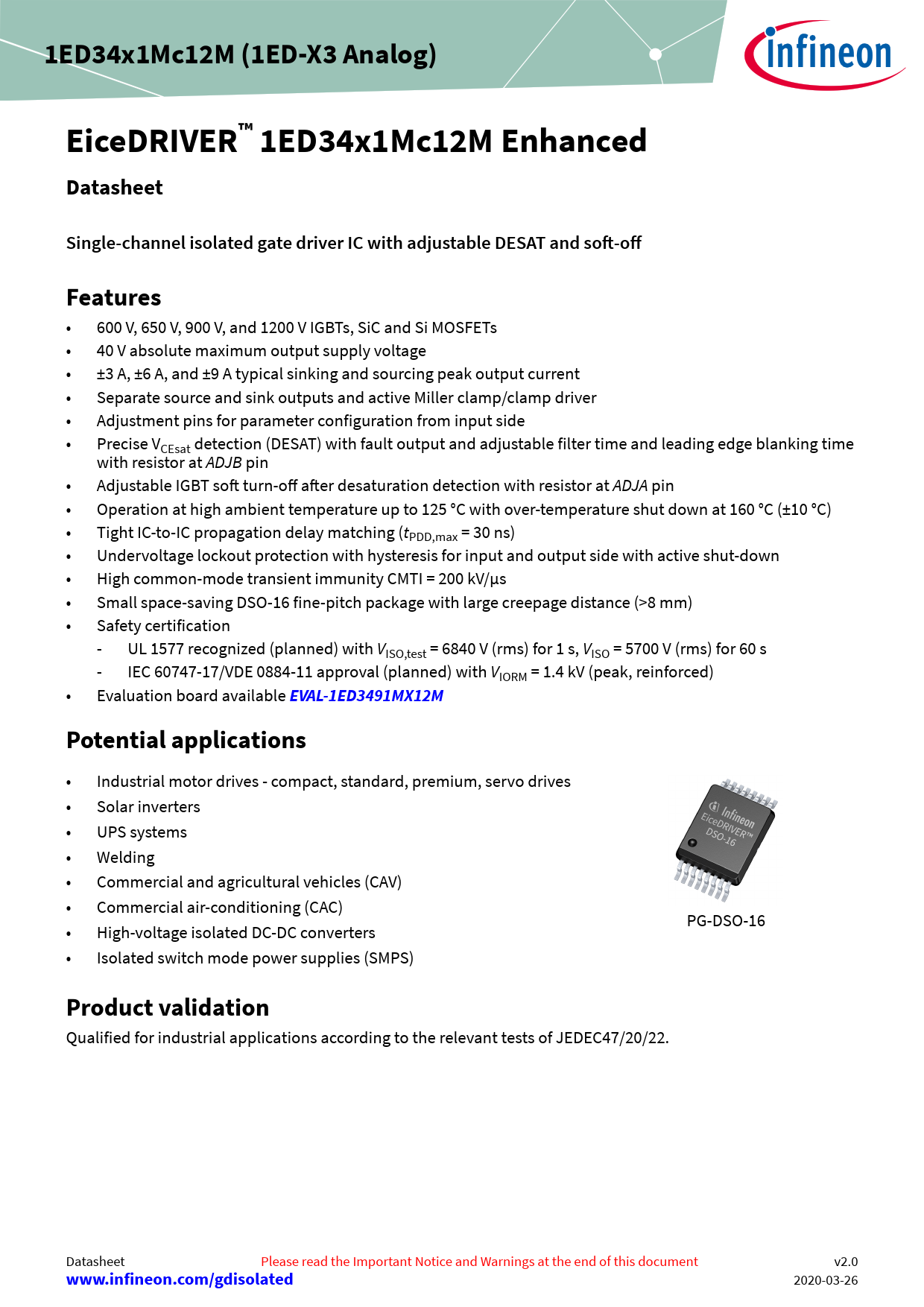 • Industrial motor drives - compact, standard, premium, servo drives • Solar inverters • UPS systems • Welding • Commercial and agricultural vehicles (CAV) • Commercial air-conditioning (CAC) PG-DSO-16 • High-voltage isolated DC-DC converters • Isolated switch mode power supplies (SMPS)