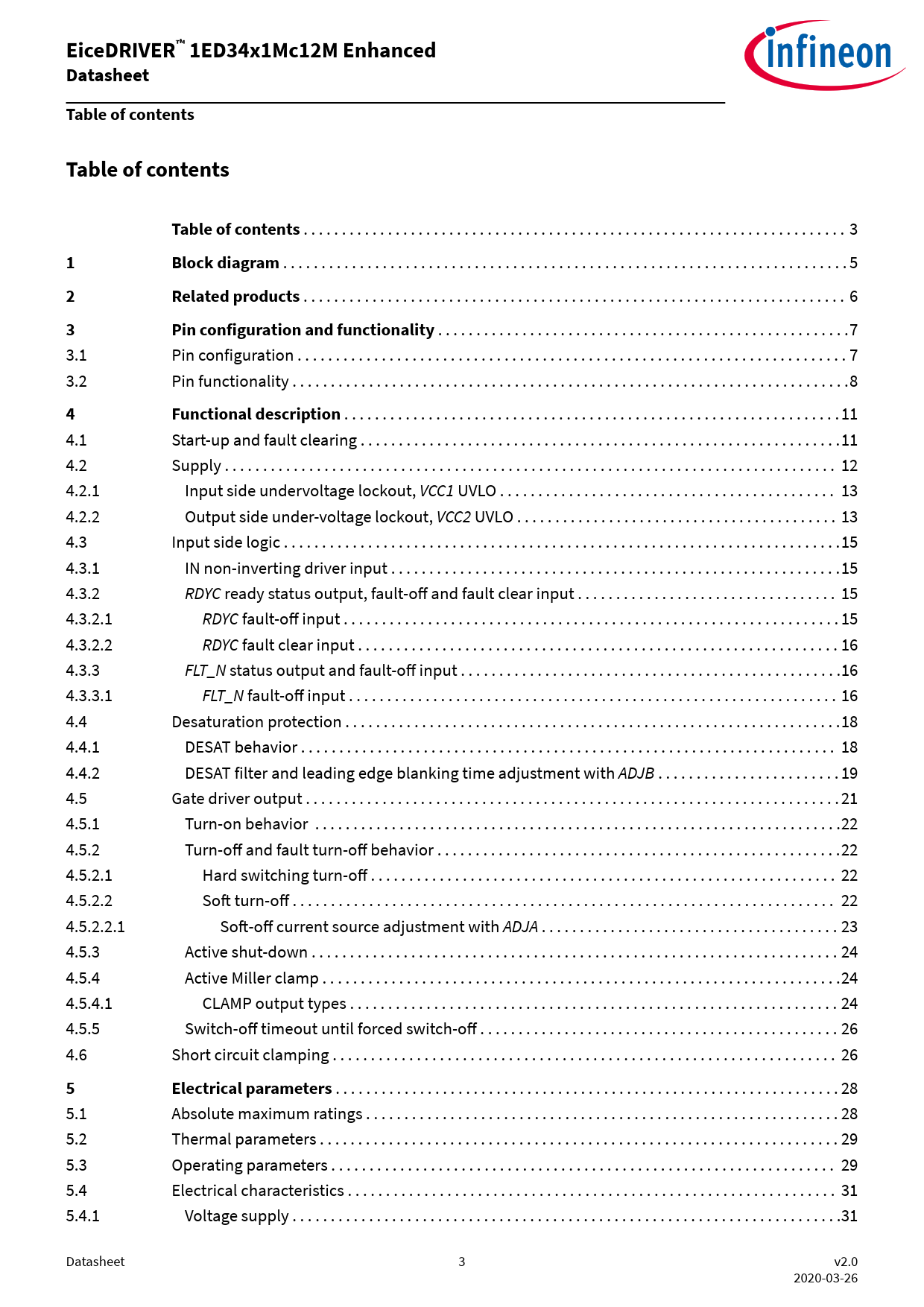 . 28 5.1 Absolute maximum ratings . 28 5.2 Thermal parameters . 29 5.3 Operating parameters . 29 5.4 Electrical characteristics . 31 5.4.1 Voltage supply . .31 Datasheet 3 v2.0 2020-03-26 Document Outline Table of contents 1 Block diagram 2 Related products 3 Pin configuration and functionality 3.1 Pin configuration 3.2 Pin functionality 4 Functional description 4.1 Start-up and fault clearing 4.2 Supply 4.2.1 Input side undervoltage lockout, VCC1 UVLO 4.2.2 Output side under-voltage lockout, VCC2 UVLO 4.3 Input side logic 4.3.1 IN non-inverting driver input 4.3.2 RDYC ready status output, fault-off and fault clear input 4.3.2.1 RDYC fault-off input 4.3.2.2 RDYC fault clear input 4.3.3 FLT_N status output and fault-off input 4.3.3.1 FLT_N fault-off input 4.4 Desaturation protection 4.4.1 DESAT behavior 4.4.2 DESAT filter and leading edge blanking time adjustment with ADJB 4.5 Gate driver output 4.5.1 Turn-on behavior 4.5.2 Turn-off and fault turn-off behavior 4.5.2.1 Hard switching turn-off 4.5.2.2 Soft turn-off 4.5.2.2.1 Soft-off current source adjustment with ADJA 4.5.3 Active shut-down 4.5.4 Active Miller clamp 4.5.4.1 CLAMP output types 4.5.5 Switch-off timeout until forced switch-off 4.6 Short circuit clamping 5 Electrical parameters 5.1 Absolute maximum ratings 5.2 Thermal parameters 5.3 Operating parameters 5.4 Electrical characteristics 5.4.1 Voltage supply 5.4.2 Logic input and output 5.4.3 Analog input 5.4.4 Gate driver 5.4.5 Active Miller clamp 5.4.6 Dynamic characteristics 5.4.7 Desaturation protection 5.4.8 Soft-off current source 5.4.9 Over-temperature protection 6 Insulation characteristics 6.1 Certified according to VDE 0884-11 and IEC 60747-17 reinforced insulation (planned) 6.2 Recognized under UL 1577 (planned) 6.3 Reliability 7 Package information 8 Application notes 8.1 Reference layout for thermal data 8.2 Printed circuit board guidelines Revision history Disclaimer