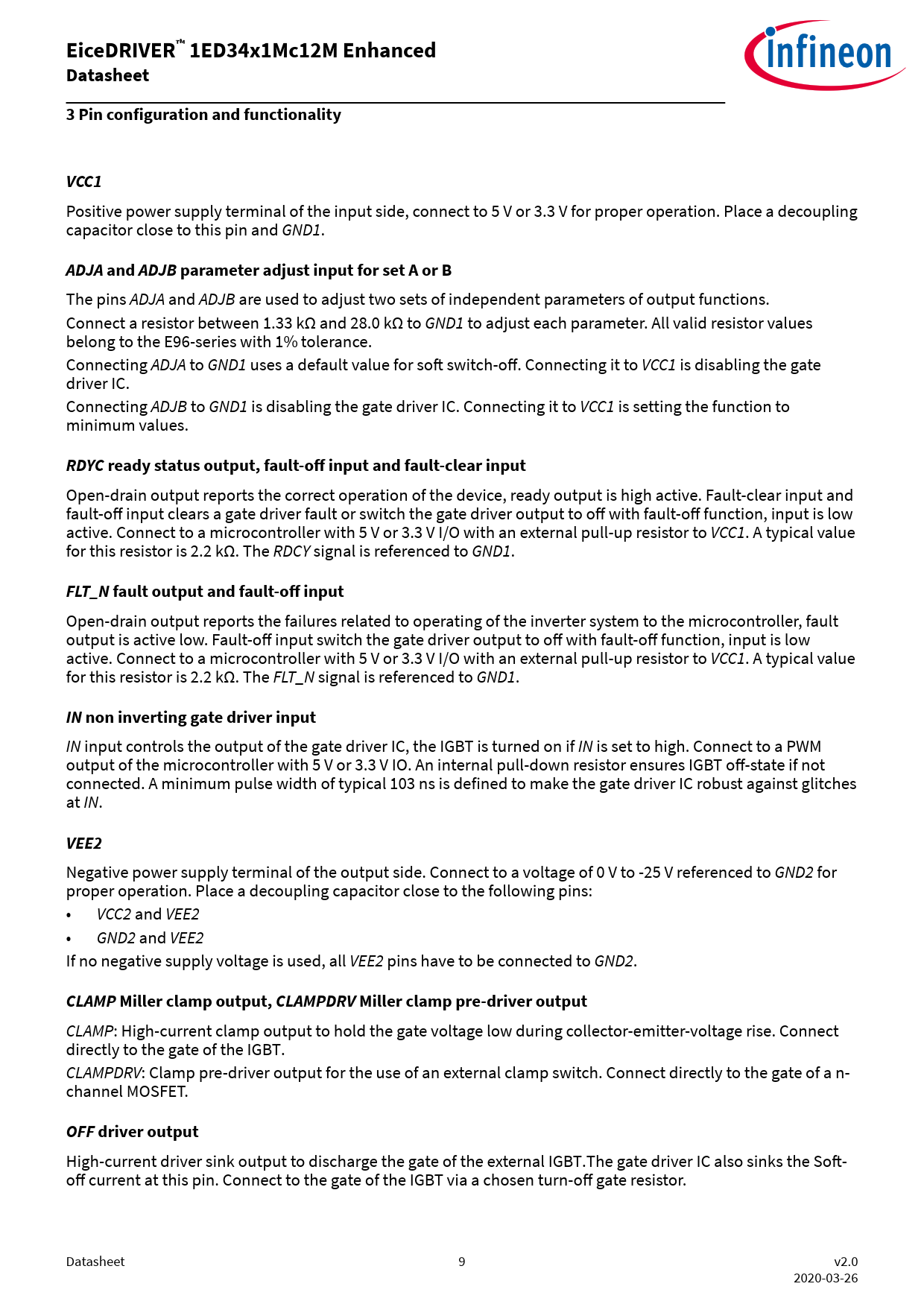 High-current driver sink output to discharge the gate of the external IGBT.The gate driver IC also sinks the Soft- off current at this pin. Connect to the gate of the IGBT via a chosen turn-off gate resistor. Datasheet 9 v2.0 2020-03-26 Document Outline Table of contents 1 Block diagram 2 Related products 3 Pin configuration and functionality 3.1 Pin configuration 3.2 Pin functionality 4 Functional description 4.1 Start-up and fault clearing 4.2 Supply 4.2.1 Input side undervoltage lockout, VCC1 UVLO 4.2.2 Output side under-voltage lockout, VCC2 UVLO 4.3 Input side logic 4.3.1 IN non-inverting driver input 4.3.2 RDYC ready status output, fault-off and fault clear input 4.3.2.1 RDYC fault-off input 4.3.2.2 RDYC fault clear input 4.3.3 FLT_N status output and fault-off input 4.3.3.1 FLT_N fault-off input 4.4 Desaturation protection 4.4.1 DESAT behavior 4.4.2 DESAT filter and leading edge blanking time adjustment with ADJB 4.5 Gate driver output 4.5.1 Turn-on behavior 4.5.2 Turn-off and fault turn-off behavior 4.5.2.1 Hard switching turn-off 4.5.2.2 Soft turn-off 4.5.2.2.1 Soft-off current source adjustment with ADJA 4.5.3 Active shut-down 4.5.4 Active Miller clamp 4.5.4.1 CLAMP output types 4.5.5 Switch-off timeout until forced switch-off 4.6 Short circuit clamping 5 Electrical parameters 5.1 Absolute maximum ratings 5.2 Thermal parameters 5.3 Operating parameters 5.4 Electrical characteristics 5.4.1 Voltage supply 5.4.2 Logic input and output 5.4.3 Analog input 5.4.4 Gate driver 5.4.5 Active Miller clamp 5.4.6 Dynamic characteristics 5.4.7 Desaturation protection 5.4.8 Soft-off current source 5.4.9 Over-temperature protection 6 Insulation characteristics 6.1 Certified according to VDE 0884-11 and IEC 60747-17 reinforced insulation (planned) 6.2 Recognized under UL 1577 (planned) 6.3 Reliability 7 Package information 8 Application notes 8.1 Reference layout for thermal data 8.2 Printed circuit board guidelines Revision history Disclaimer