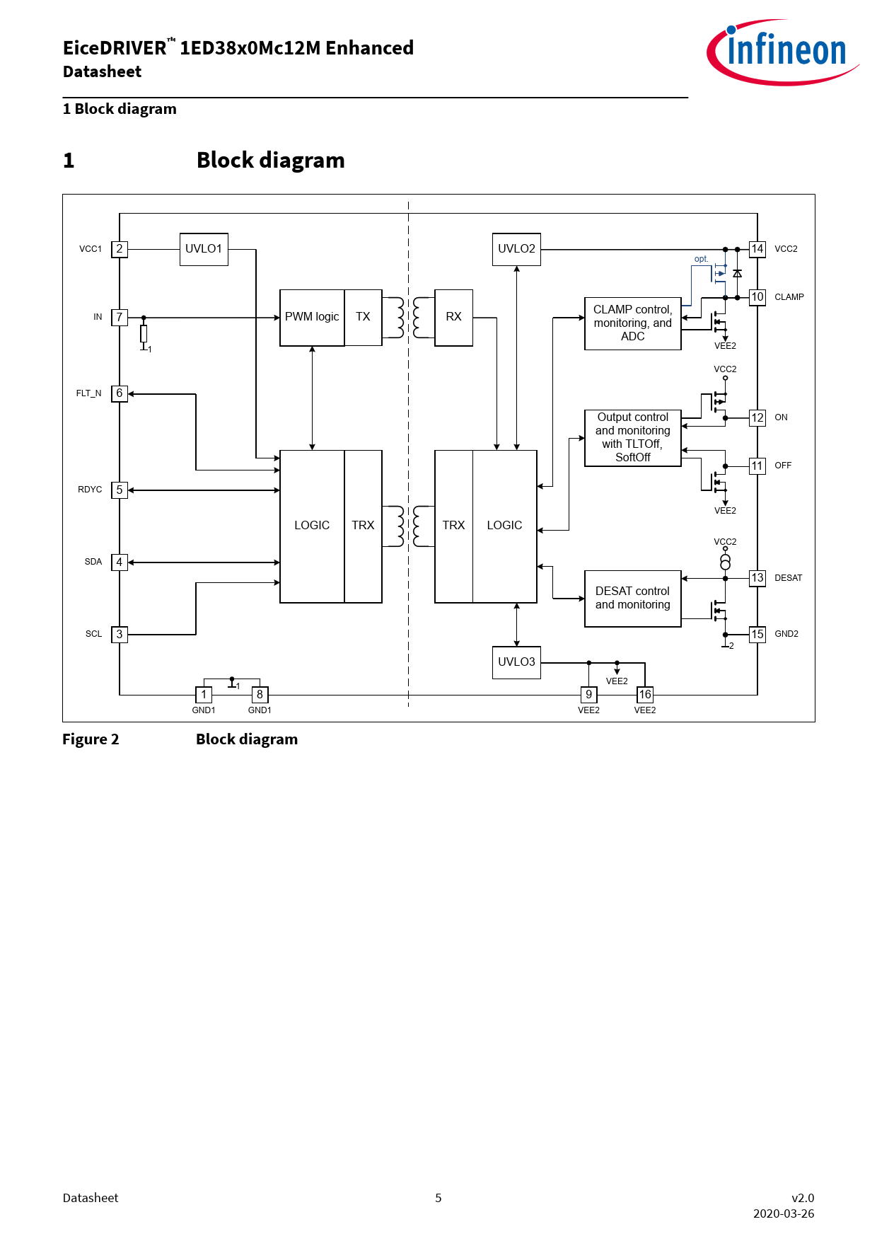 Model Line for this Datasheet Text Version of Document EiceDRIVER™ 1ED38x0Mc12M Enhanced Datasheet 1 Block diagram 1 Block diagram VCC1 2 UVLO1 UVLO2 14 VCC2 opt. 10 CLAMP CLAMP control, IN 7 PWM logic TX RX monitoring, and ADC 1 VEE2 VCC2 FLT_N 6 Output control 12 ON and monitoring with TLTOff, SoftOff 11 OFF RDYC 5 VEE2 LOGIC TRX TRX LOGIC VCC2 SDA 4 13 DESAT DESAT control and monitoring SCL 3 15 GND2 2 UVLO3 VEE2 1 1 8 9 16 GND1 GND1 VEE2 VEE2Figure 2 Block diagram Datasheet 5 v2.0 2020-03-26 Document Outline Table of contents 1 Block diagram 2 Related products 3 Pin configuration and functionality 3.1 Pin configuration 3.2 Pin functionality 3.3 Configurable parameters via I2C 4 Functional description 4.1 Start-up and fault clearing 4.2 Supply 4.3 Input side logic 4.4 I2C bus 4.5 Operating states 4.6 Measurement 4.7 Monitoring 4.8 Desaturation protection 4.8.1 DESAT behavior 4.9 Gate driver output 4.9.1 Turn-on behavior 4.9.2 Turn-off and fault turn-off behavior 4.9.2.1 Hard switching turn-off 4.9.2.2 Two-level turn-off 4.9.2.3 Soft turn-off 4.9.3 Active shut-down 4.9.4 Active Miller clamp 4.10 Short circuit clamping 5 Electrical parameters 5.1 Absolute maximum ratings 5.2 Thermal parameters 5.3 Operating parameters 5.4 Electrical characteristics 5.4.1 Voltage supply 5.4.2 Logic input and output 5.4.3 Gate driver 5.4.4 Active Miller clamp 5.4.5 Dynamic characteristics 5.4.6 Desaturation protection 5.4.7 Two-level turn-off 5.4.8 Soft-off current source 5.4.9 Over-temperature protection 5.4.10 ADC measurement 6 Insulation characteristics 6.1 Certified according to VDE 0884-11 and IEC 60747-17 reinforced insulation (planned) 6.2 Recognized under UL 1577 (planned) 7 Package information Revision history Disclaimer