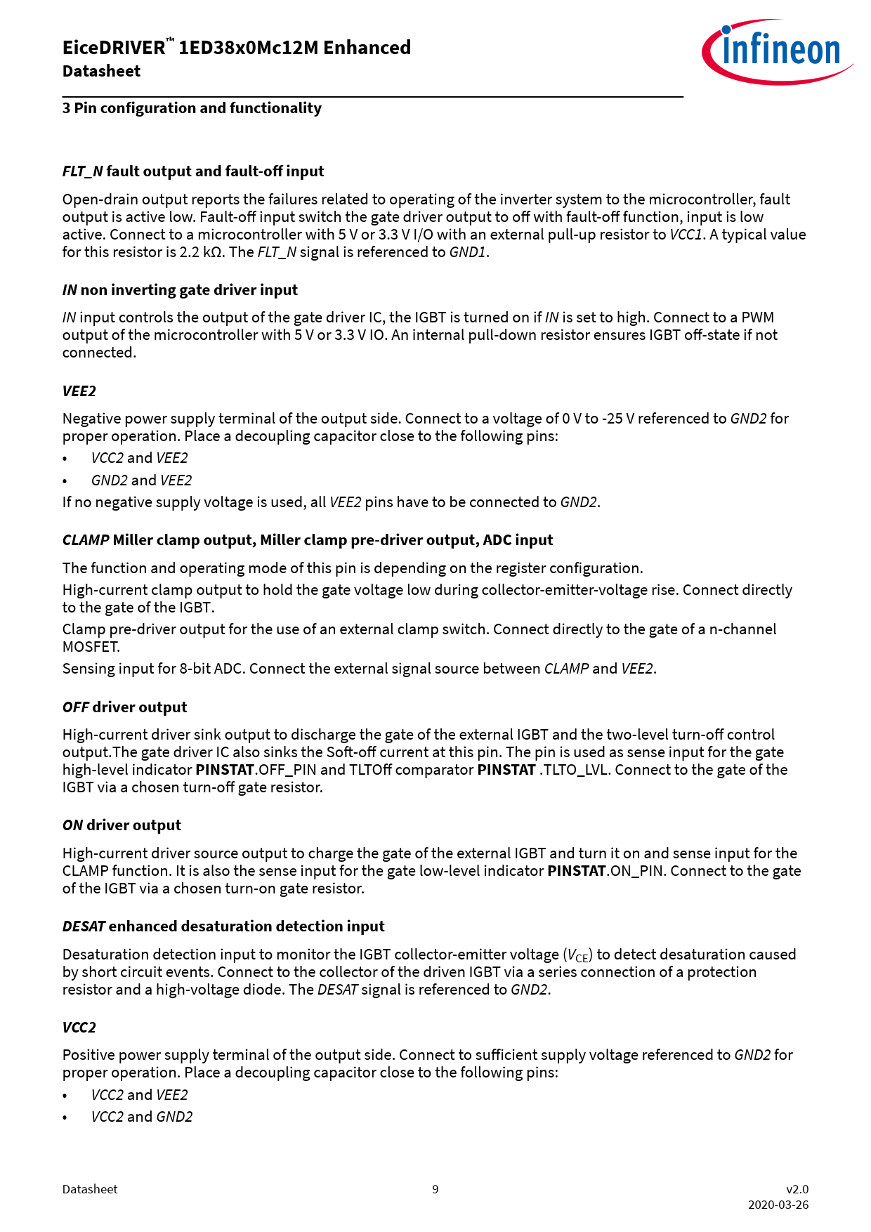 Positive power supply terminal of the output side. Connect to sufficient supply voltage referenced to GND2 for proper operation. Place a decoupling capacitor close to the following pins: • VCC2 and VEE2 • VCC2 and GND2 Datasheet 9 v2.0 2020-03-26 Document Outline Table of contents 1 Block diagram 2 Related products 3 Pin configuration and functionality 3.1 Pin configuration 3.2 Pin functionality 3.3 Configurable parameters via I2C 4 Functional description 4.1 Start-up and fault clearing 4.2 Supply 4.3 Input side logic 4.4 I2C bus 4.5 Operating states 4.6 Measurement 4.7 Monitoring 4.8 Desaturation protection 4.8.1 DESAT behavior 4.9 Gate driver output 4.9.1 Turn-on behavior 4.9.2 Turn-off and fault turn-off behavior 4.9.2.1 Hard switching turn-off 4.9.2.2 Two-level turn-off 4.9.2.3 Soft turn-off 4.9.3 Active shut-down 4.9.4 Active Miller clamp 4.10 Short circuit clamping 5 Electrical parameters 5.1 Absolute maximum ratings 5.2 Thermal parameters 5.3 Operating parameters 5.4 Electrical characteristics 5.4.1 Voltage supply 5.4.2 Logic input and output 5.4.3 Gate driver 5.4.4 Active Miller clamp 5.4.5 Dynamic characteristics 5.4.6 Desaturation protection 5.4.7 Two-level turn-off 5.4.8 Soft-off current source 5.4.9 Over-temperature protection 5.4.10 ADC measurement 6 Insulation characteristics 6.1 Certified according to VDE 0884-11 and IEC 60747-17 reinforced insulation (planned) 6.2 Recognized under UL 1577 (planned) 7 Package information Revision history Disclaimer