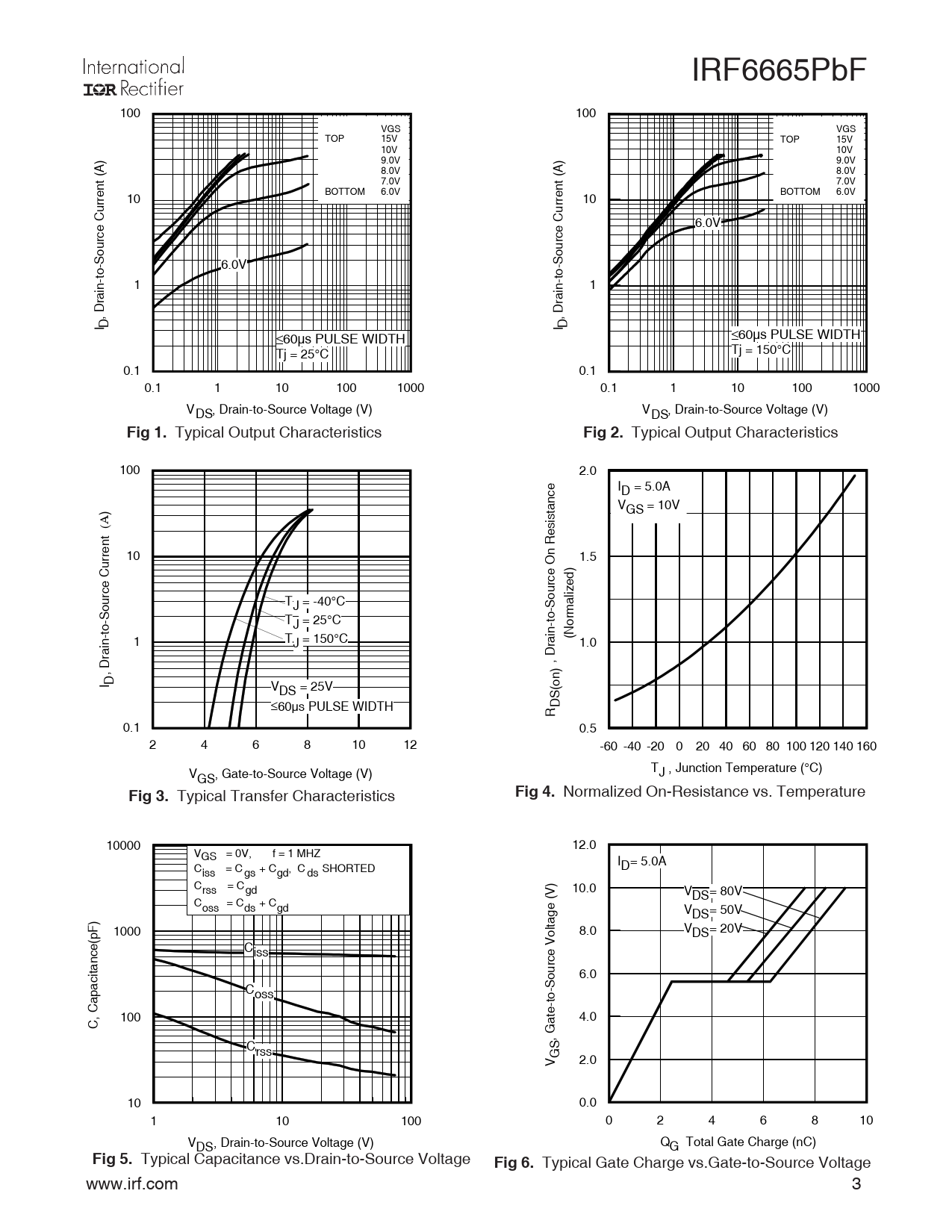 IRF6665PbF 100 100 VGS VGS TOP 15V TOP 15V 10V 10V ) 9.0V ) 9.0V A( A 8.0V 8.0V t ( n 7.0V t 7.0V e n r BOTTOM 6.0V e BOTTOM 6.0V r 10 rr 10 u u C C e 6.0V c e r c u r o uo S- S o 6.0V - t o - t n 1 - i n 1 a i r ar D , D , I D I D ≤60µs PULSE WIDTH ≤60µs PULSE WIDTH Tj = 25°C Tj = 150°C 0.1 0.1 0.1 1 10 100 1000 0.1 1 10 100 1000 VDS, Drain-to-Source Voltage (V) VDS, Drain-to-Source Voltage (V) Fig 1. Typical Output Characteristics Fig 2. Typical Output Characteristics 100 2.0 ec ID = 5.0A na ) t V s GS = 10V Α i ( s e tn R er n r 10 1.5 O u C e ) c e r d c u ez r o il u TJ = -40°C S a o - S o m - T t r J = 25°C - o ot n - i N n T a ( i 1 J = 150°C r 1.0 a D r , D ) , n I D o V ( DS = 25V S D ≤60µs PULSE WIDTH R 0.1 0.5 2 4 6 8 10 12 -60 -40 -20 0 20 40 60 80 100 120 140 160 T V J , Junction Temperature (°C) GS, Gate-to-Source Voltage (V) Fig 3. Typical Transfer Characteristics Fig 4. Normalized On-Resistance vs. Temperature 10000 12.0 VGS = 0V, f = 1 MHZ I C D= 5.0A iss = C gs + Cgd, C ds SHORTED C ) rss = Cgd 10.0 V( VDS= 80V C oss = Cds + Cgd eg V ) a DS= 50V F t 1000 l p o 8.0 V ( DS= 20V e V c Ciss e n c a r ti u c o 6.0 a S p C - a oss ot C - , e 100 t 4.0 C a G , Crss S GV 2.0 10 0.0 1 10 100 0 2 4 6 8 10 VDS, Drain-to-Source Voltage (V) QG Total Gate Charge (nC) Fig 5. Typical Capacitance vs.Drain-to-Source Voltage Fig 6. Typical Gate Charge vs.Gate-to-Source Voltage www.irf.com 3