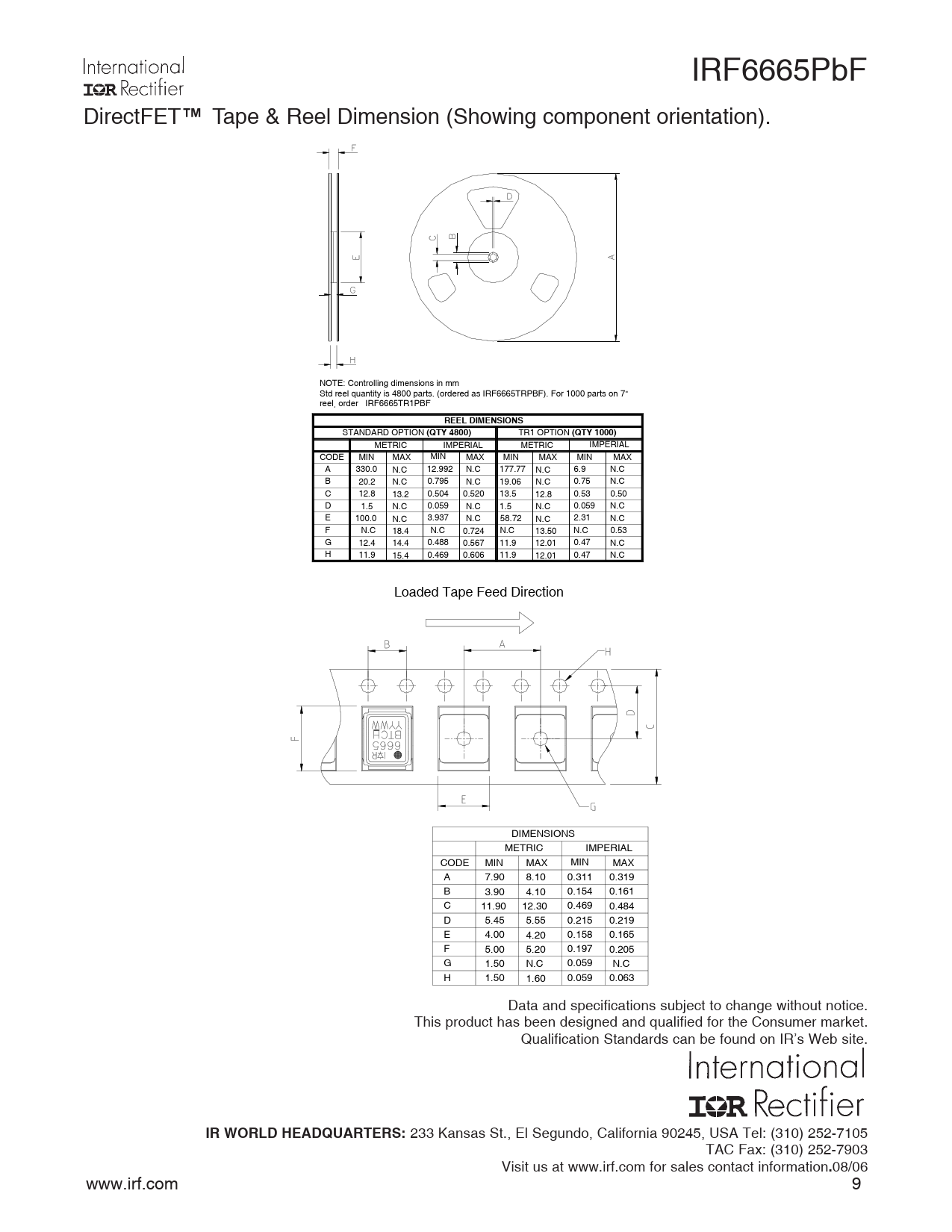 REEL DIMENSIONS. (QTY 4800). (QTY 1000). IR WORLD HEADQUARTERS: